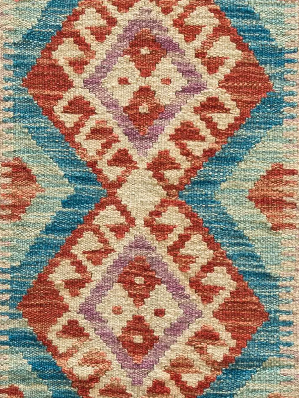 gehört zu den Schlitzkelims. Beim Schlitzkelim entsteht das Muster durch das farbige Schussmaterial, das bei einem Farbwechsel wieder zurück geführt wird. Dadurch entsteht ein sichtbarer Schlitz. Die Fadenenden werden eingearbeitet und sind nicht zu sehen. Durch diese Webart ist der AfghanKelim