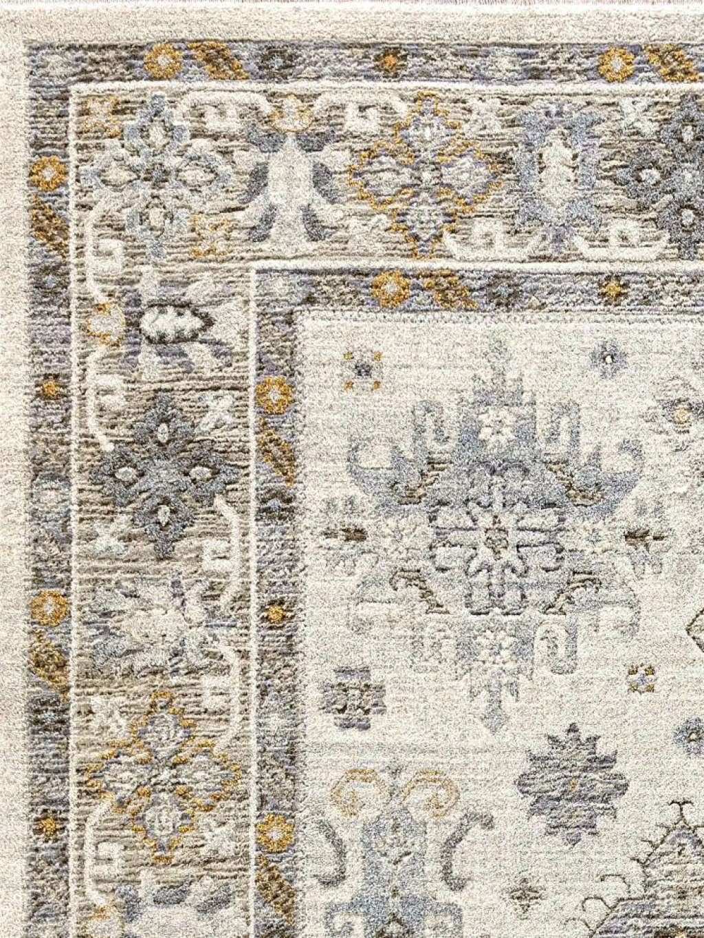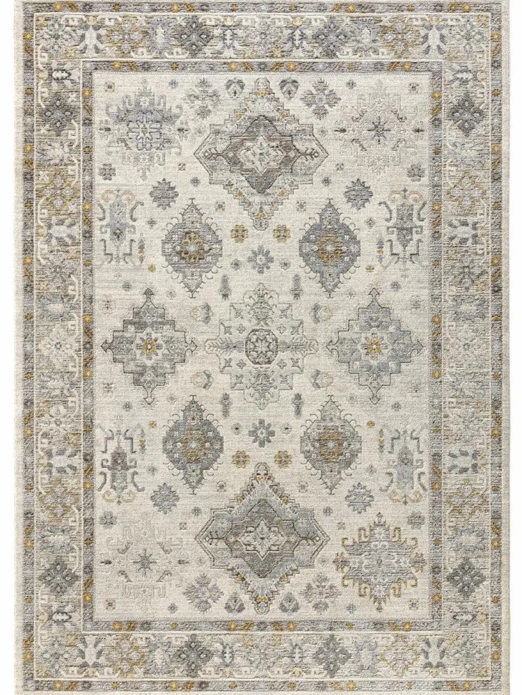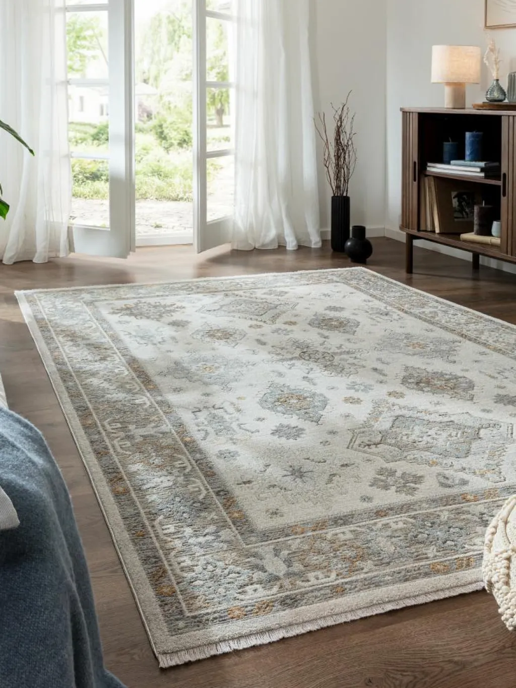 , der an die Designs klassischer Orientteppiche erinnert. Die dezenten Farbkombinationen mit den kurzen, unauffälligenFransen