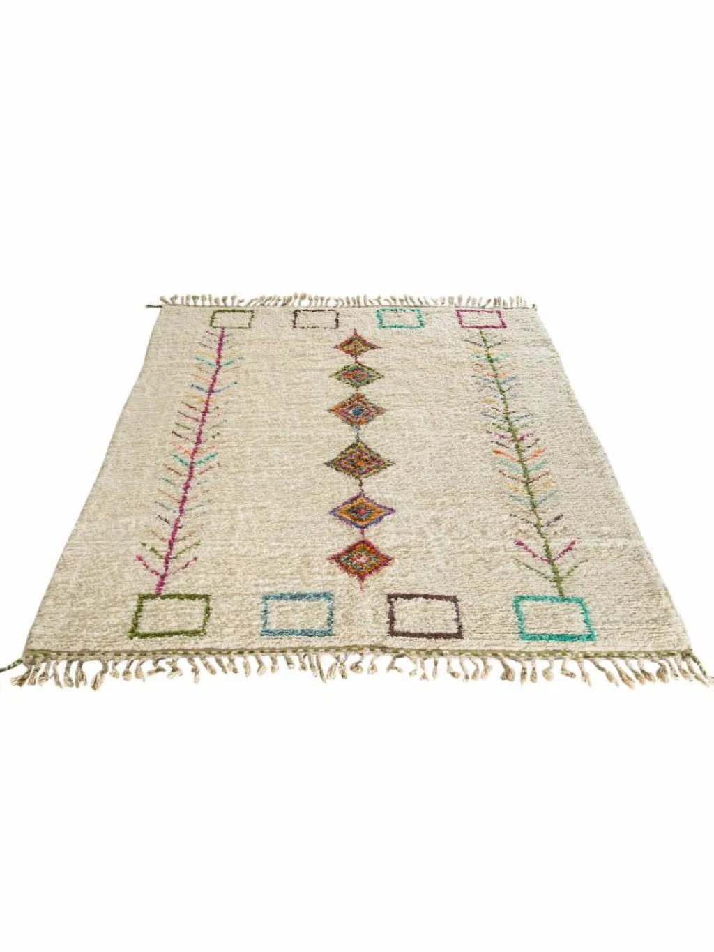 . Hier werden eher niedrigflorige weißgrundige Teppiche mit Designs aus oft bunterWolle