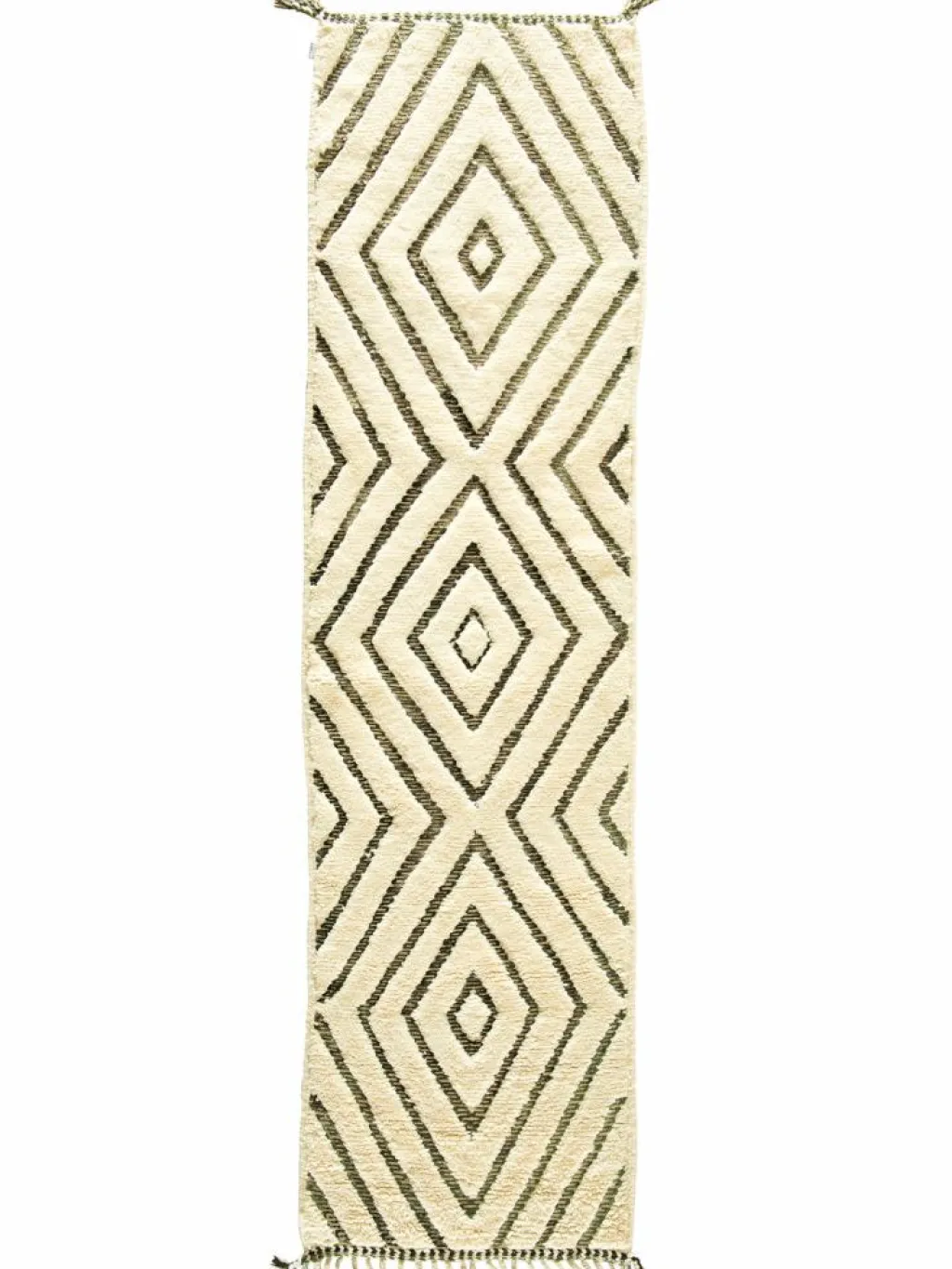 . Die Teppiche sind fast immer weißgrundig und zeichnen sich durch schwarze Zickzack-, Gitter- oder Rauten-Muster sowie einem wohnlich-zotteligen Flor aus. Kaum eine andere Teppichprovenienz passt mit ihren ursprünglichen nomadischen Designs besser in einen minimalistischen Wohnstil. Wie viele andere Nomadenteppiche auch, wurden dieBeni Ourain