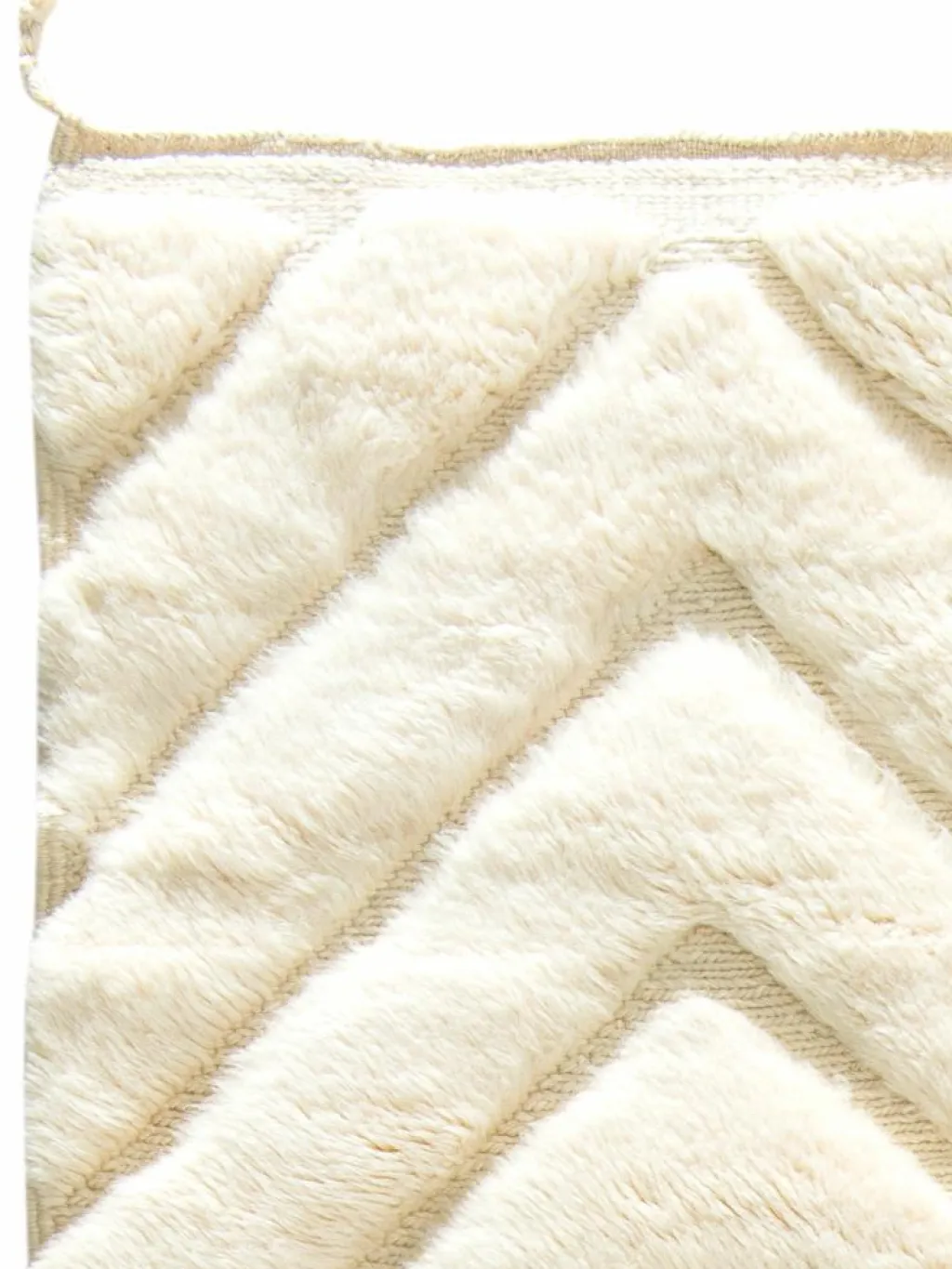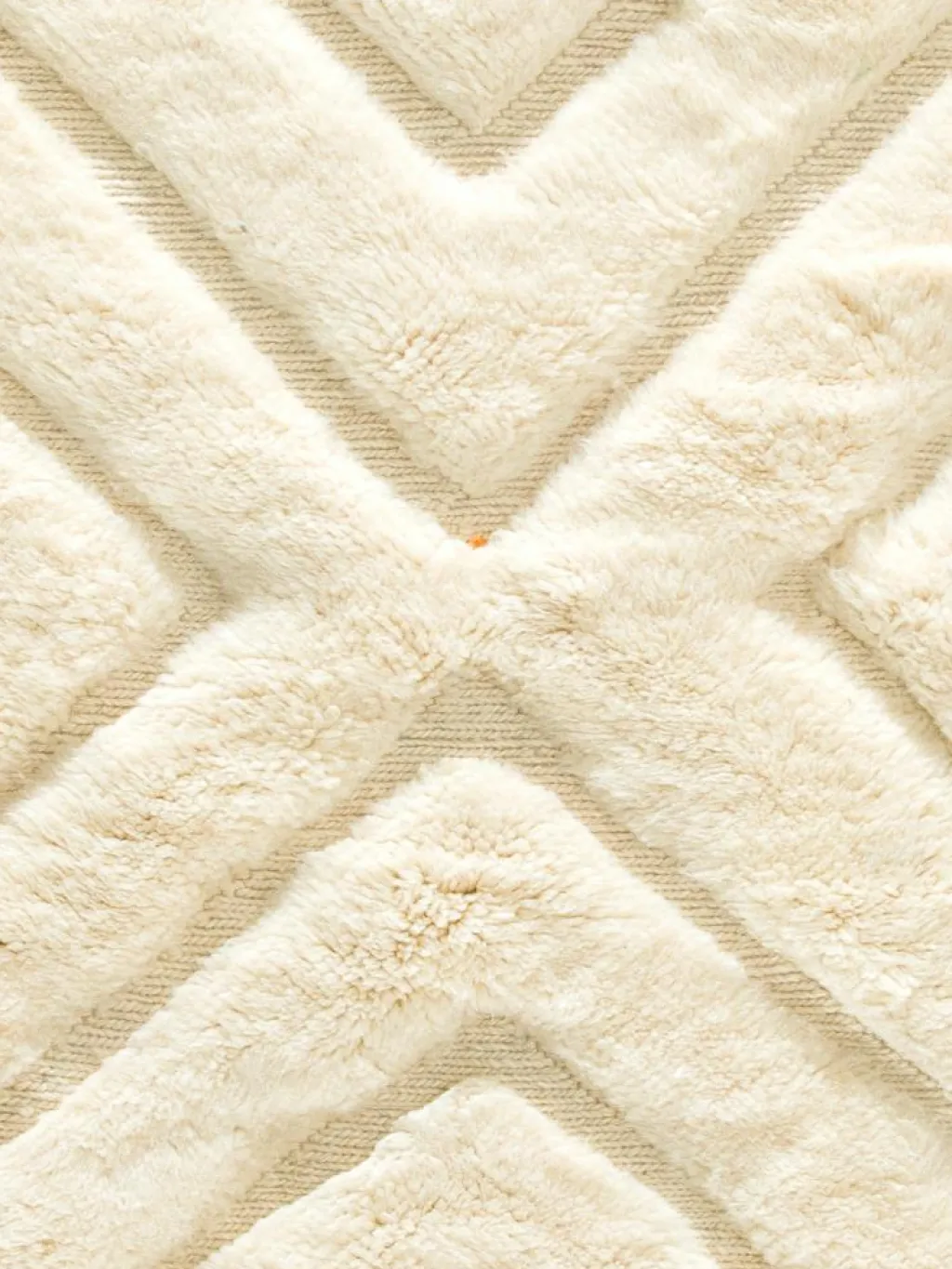 . Die Teppiche sind fast immer weißgrundig und zeichnen sich durch schwarze Zickzack-, Gitter- oder Rauten-Muster sowie einem wohnlich-zotteligen Flor aus. Kaum eine andere Teppichprovenienz passt mit ihren ursprünglichen nomadischen Designs besser in einen minimalistischen Wohnstil. Wie viele andere Nomadenteppiche auch, wurden dieBeni Ourain