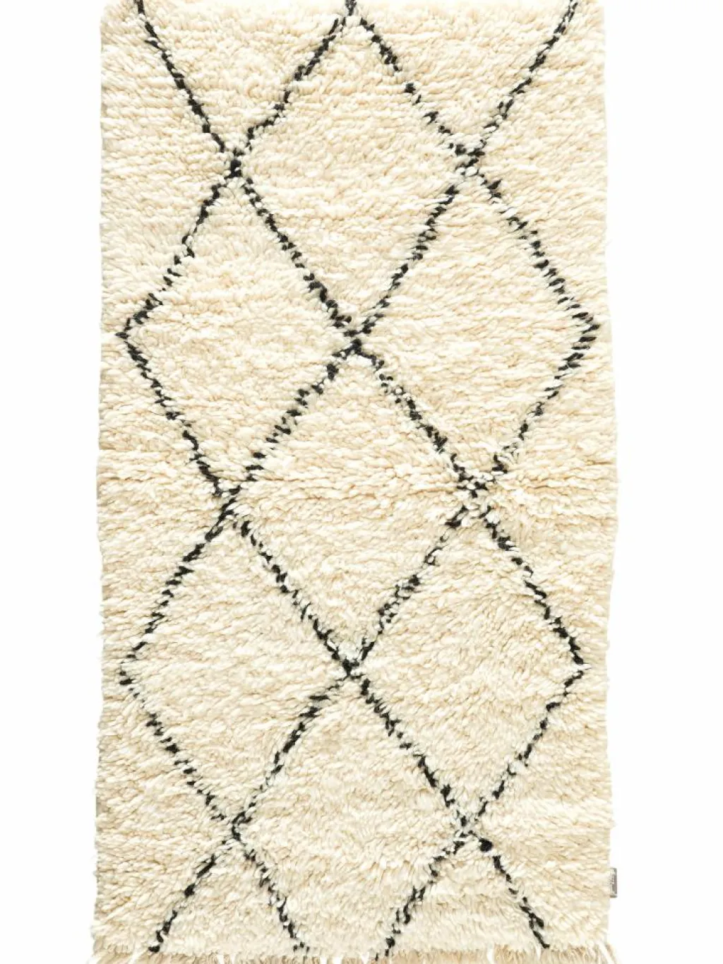 . Die Teppiche sind fast immer weißgrundig und zeichnen sich durch schwarze Zickzack-, Gitter- oder Rauten-Muster sowie einem wohnlich-zotteligen Flor aus. Kaum eine andere Teppichprovenienz passt mit ihren ursprünglichen nomadischen Designs besser in einen minimalistischen Wohnstil. Wie viele andere Nomadenteppiche auch, wurden dieBeni Ourain