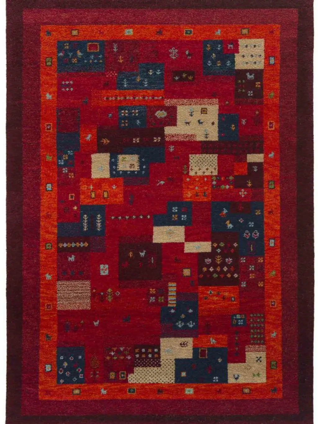 ist handgeknüpft. Ca. 5000 g pro m², ca. 53.000 Knoten pro m². Die typische vielfältige Musterung macht diesenGabbeh