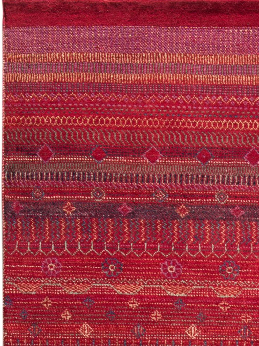 ist eine ungewöhnliche moderne Variation des traditionellen persichen Gabbehs. Er ist kürzer im Flor und feiner geknüpft. Es gibt zahllose Neukreationen in individuellen und einzigartigen Farben und Mustern. – Fein geknüpft inDouble-Knot