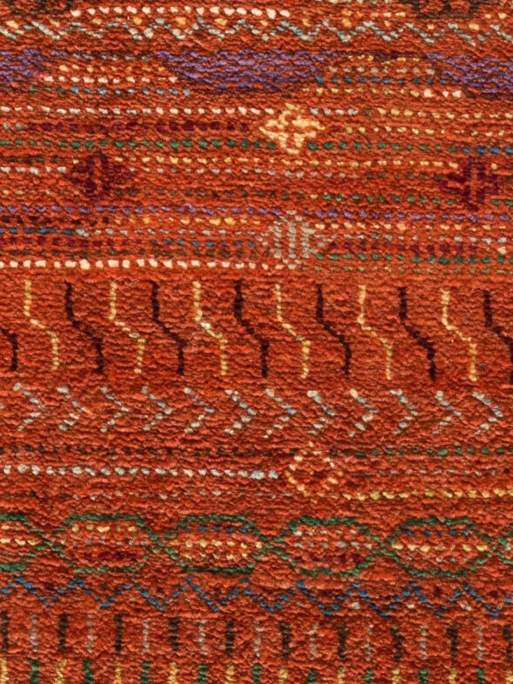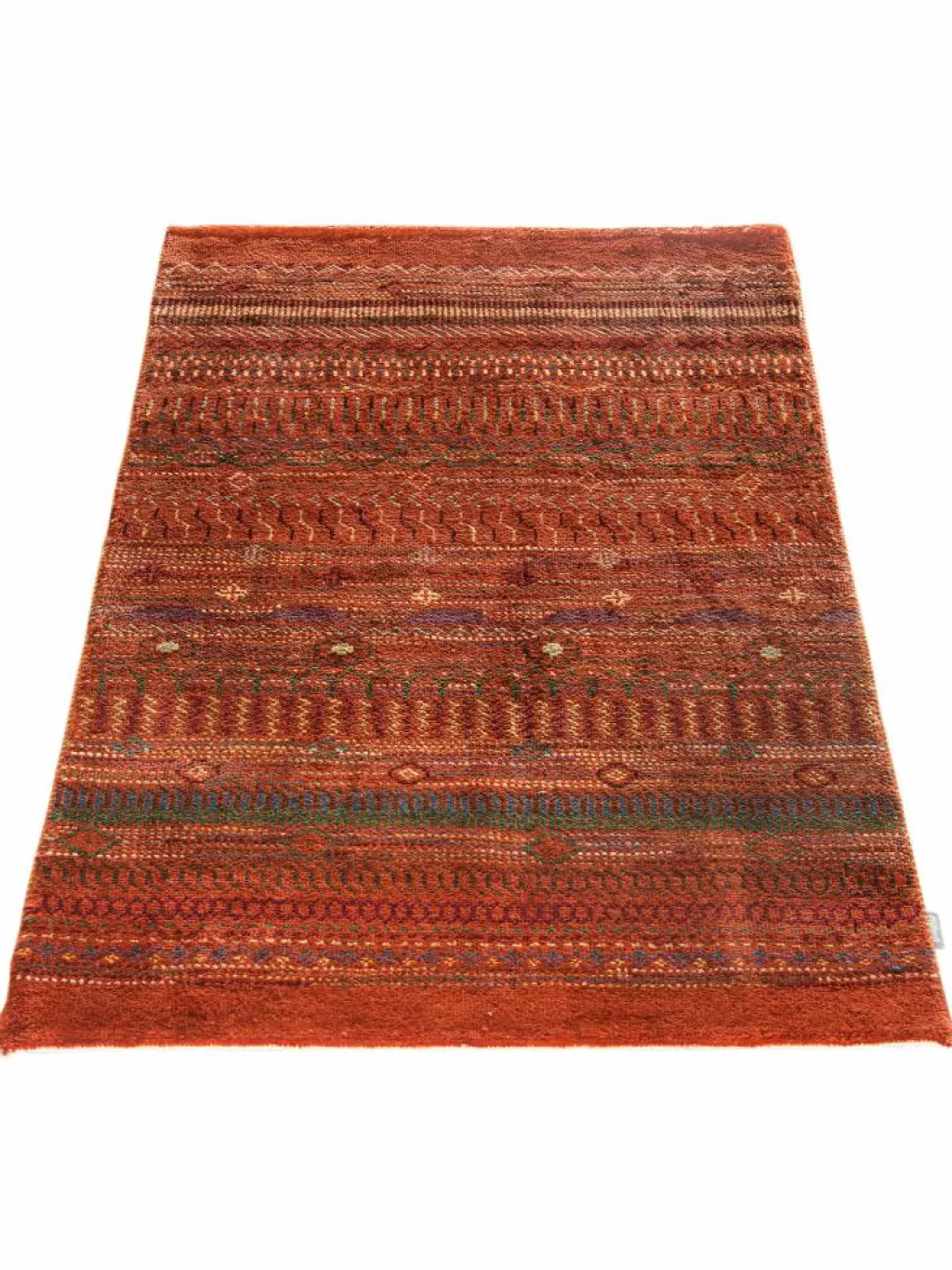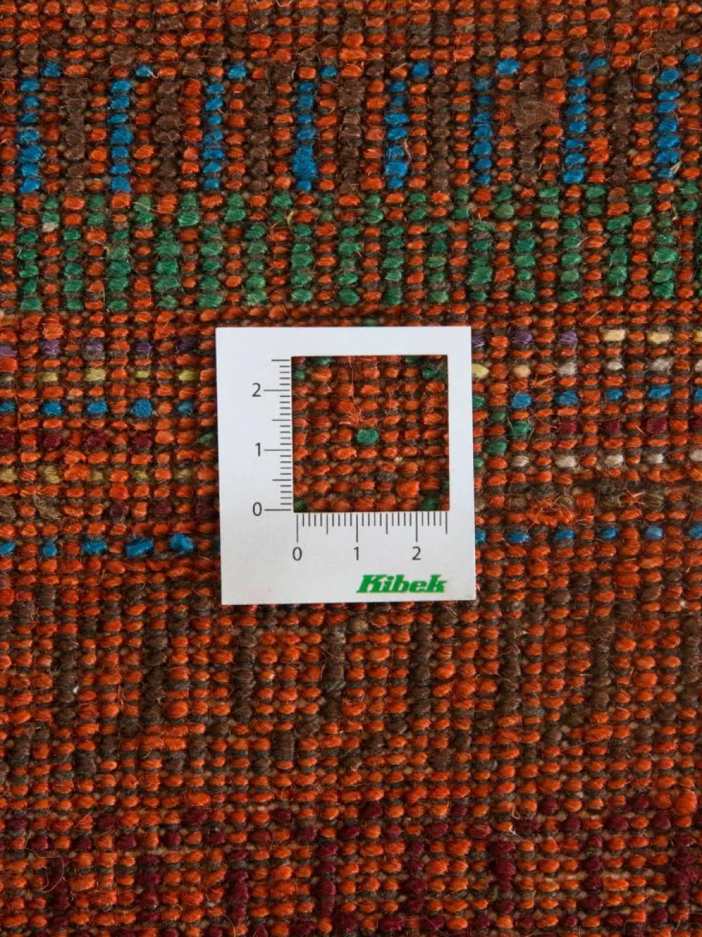 ist eine ungewöhnliche moderne Variation des traditionellen persichen Gabbehs. Er ist kürzer im Flor und feiner geknüpft. Es gibt zahllose Neukreationen in individuellen und einzigartigen Farben und Mustern.| Gesamthöhe: | ca. 10 mm |