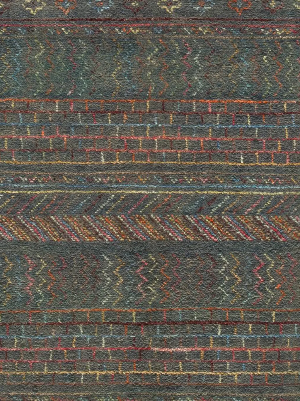 ist eine ungewöhnliche moderne Variation des traditionellen persichen Gabbehs. Er ist kürzer im Flor und feiner geknüpft. Es gibt zahllose Neukreationen in individuellen und einzigartigen Farben und Mustern.| Gesamthöhe: | ca. 8 mm |