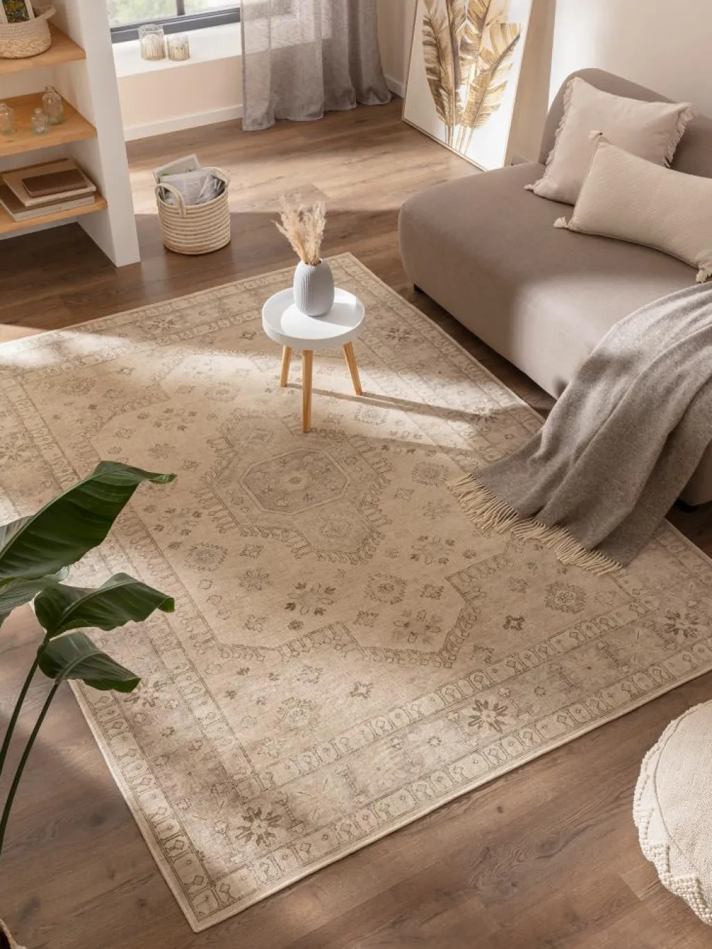 -Optik entstehen durch einen Digitaldruck und bringen Wärme und Gemütlichkeit in die Wohnbereiche. Die dezenten Farben des handgewebten Teppichs ergänzen jeden Raum und wirkend beruhigend. Das Besondere: Er ist waschbar, was ihn besonders flexibel verwendbar und unempfindlich macht. Waschbar bis 30 °C. Oberfläche aus 60% Baumwolle,40% Polyester.| Art: | Vintage-Teppich |