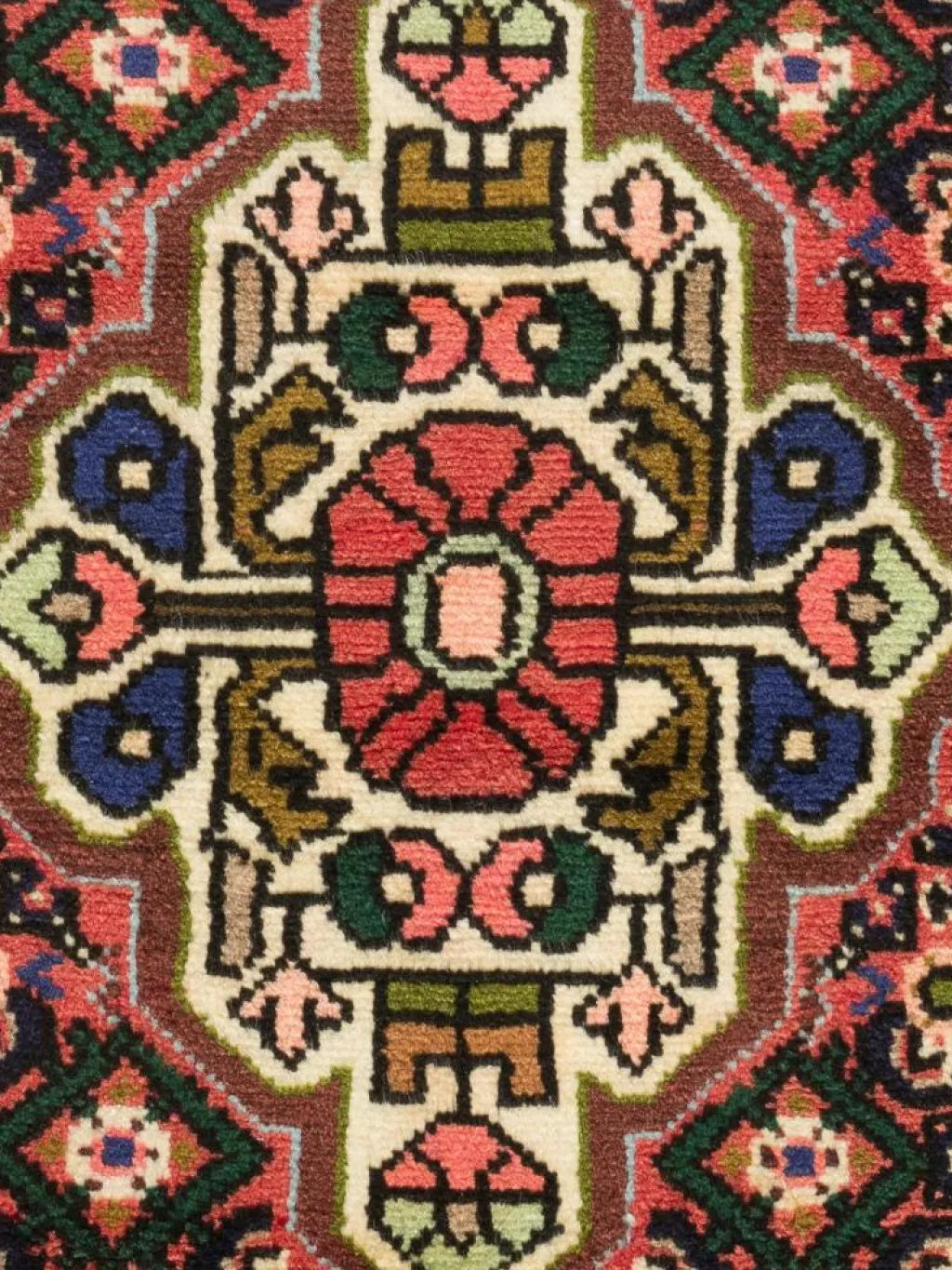 geknüpft oder von einem kleinen rautenförmigen Mittelmedaillon unterbrachen, das durch entsprechende Eckzwickel bildlich ausgeglichen wird.Die Gegend umHamadan