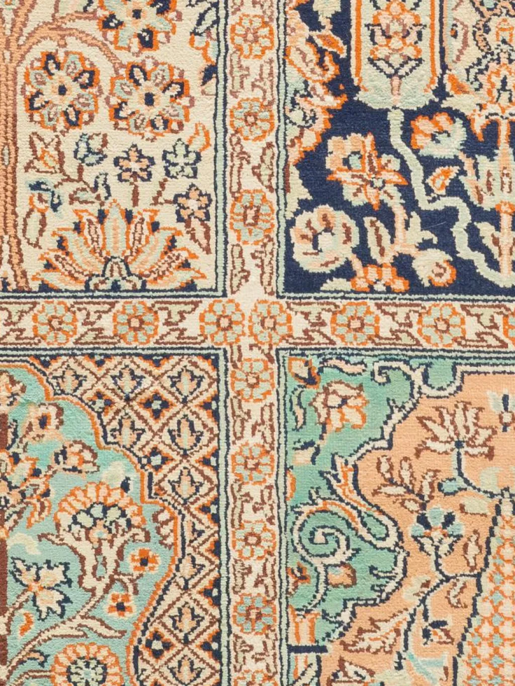 -Teppiche sind eher zurückhaltend, die Muster nach wie vor sehr stark persisch beeinflusst. Florale Motive und das persischeFeldermuster