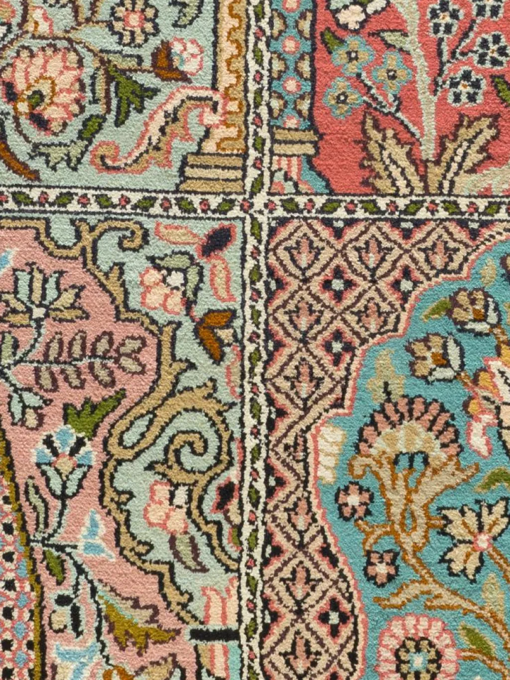 -Teppiche sind eher zurückhaltend, die Muster nach wie vor sehr stark persisch beeinflusst. Florale Motive und das persischeFeldermuster