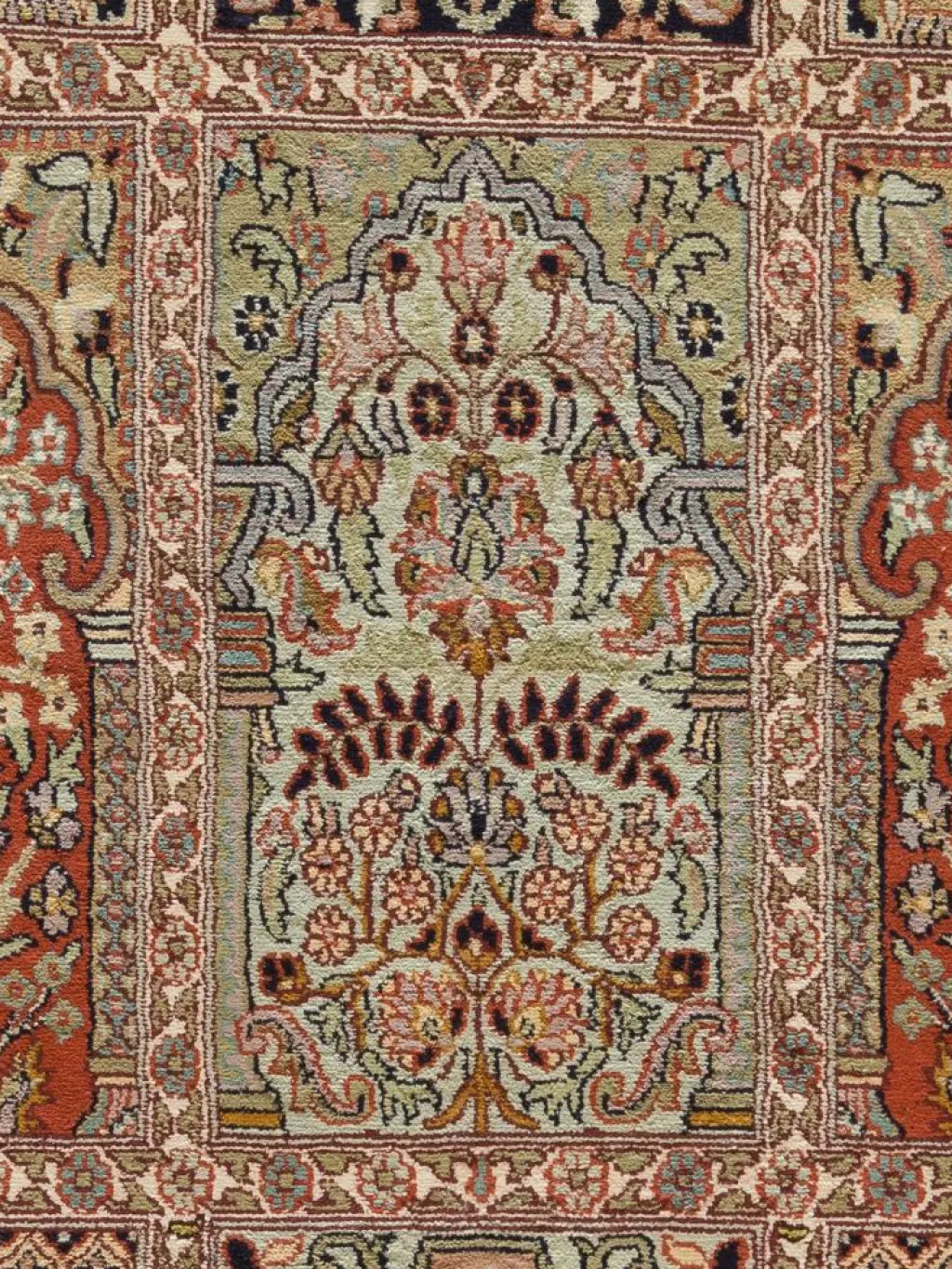 -Teppiche sind eher zurückhaltend, die Muster nach wie vor sehr stark persisch beeinflusst. Florale Motive und das persischeFeldermuster