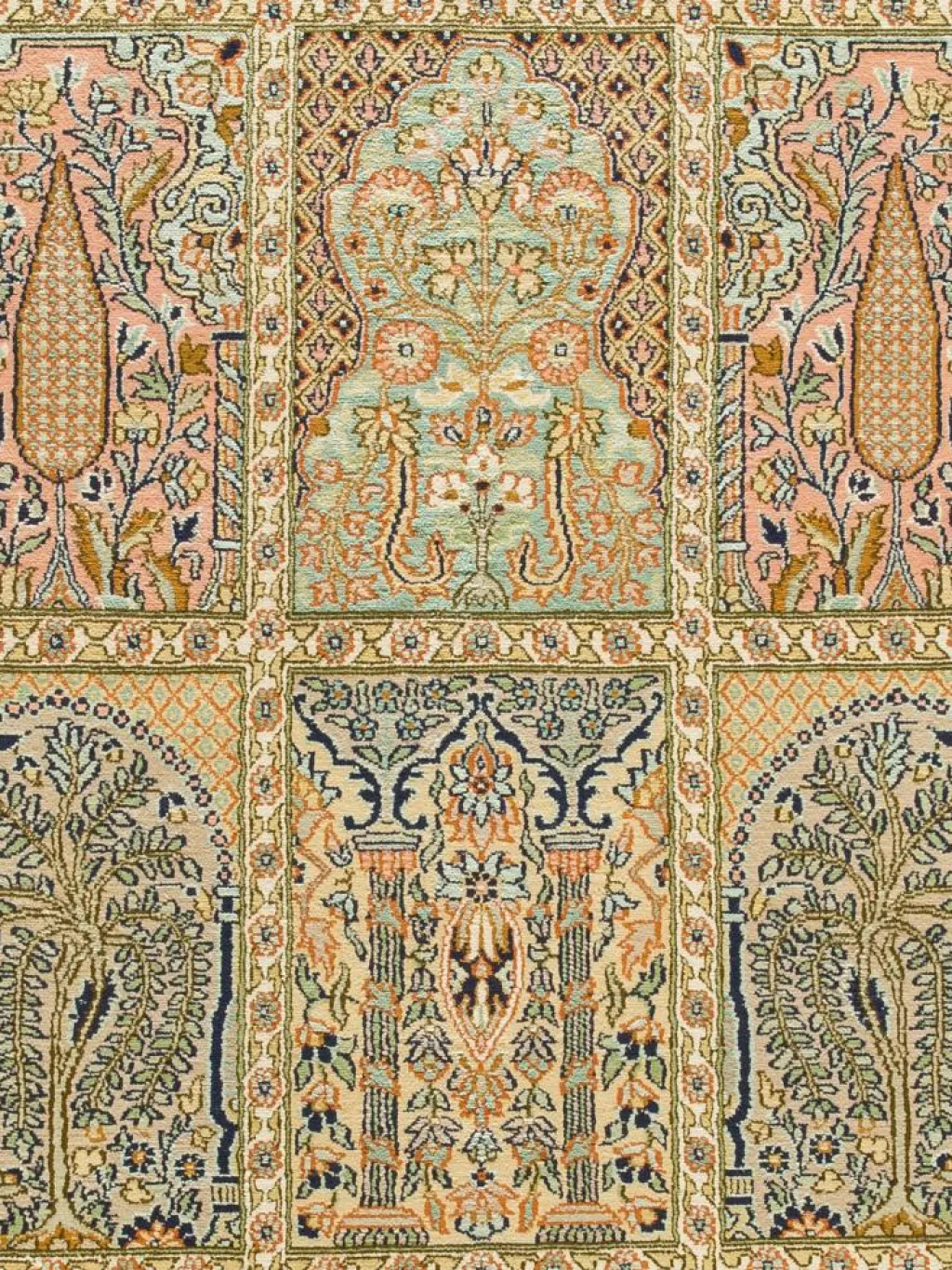 -Teppiche sind eher zurückhaltend, die Muster nach wie vor sehr stark persisch beeinflusst. Florale Motive und das persischeFeldermuster