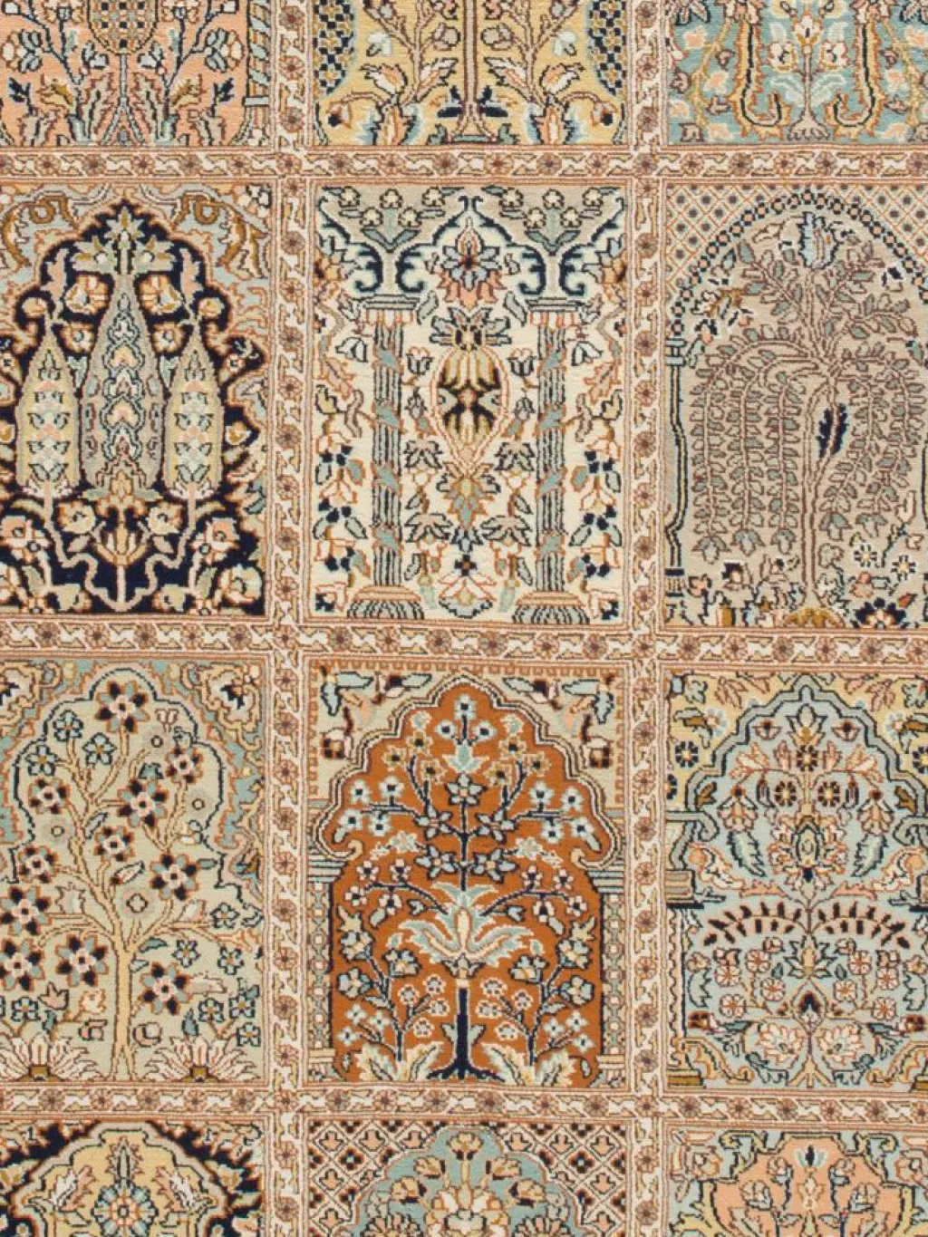 -Teppiche sind eher zurückhaltend, die Muster nach wie vor sehr stark persisch beeinflusst. Florale Motive und das persischeFeldermuster