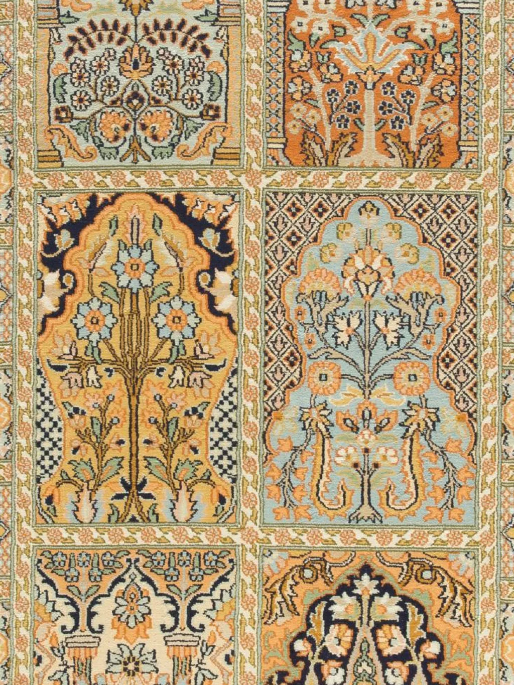 -Teppiche sind eher zurückhaltend, die Muster nach wie vor sehr stark persisch beeinflusst. Florale Motive und das persischeFeldermuster