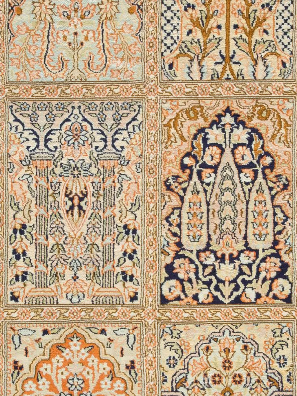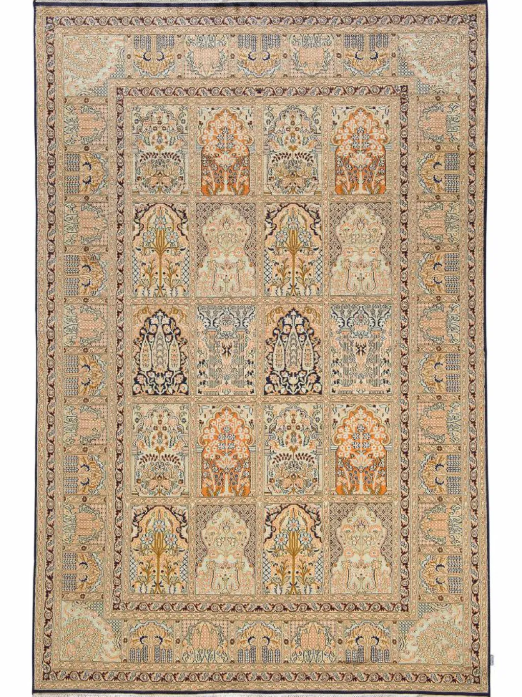 -Teppiche sind eher zurückhaltend, die Muster nach wie vor sehr stark persisch beeinflusst. Florale Motive und das persischeFeldermuster
