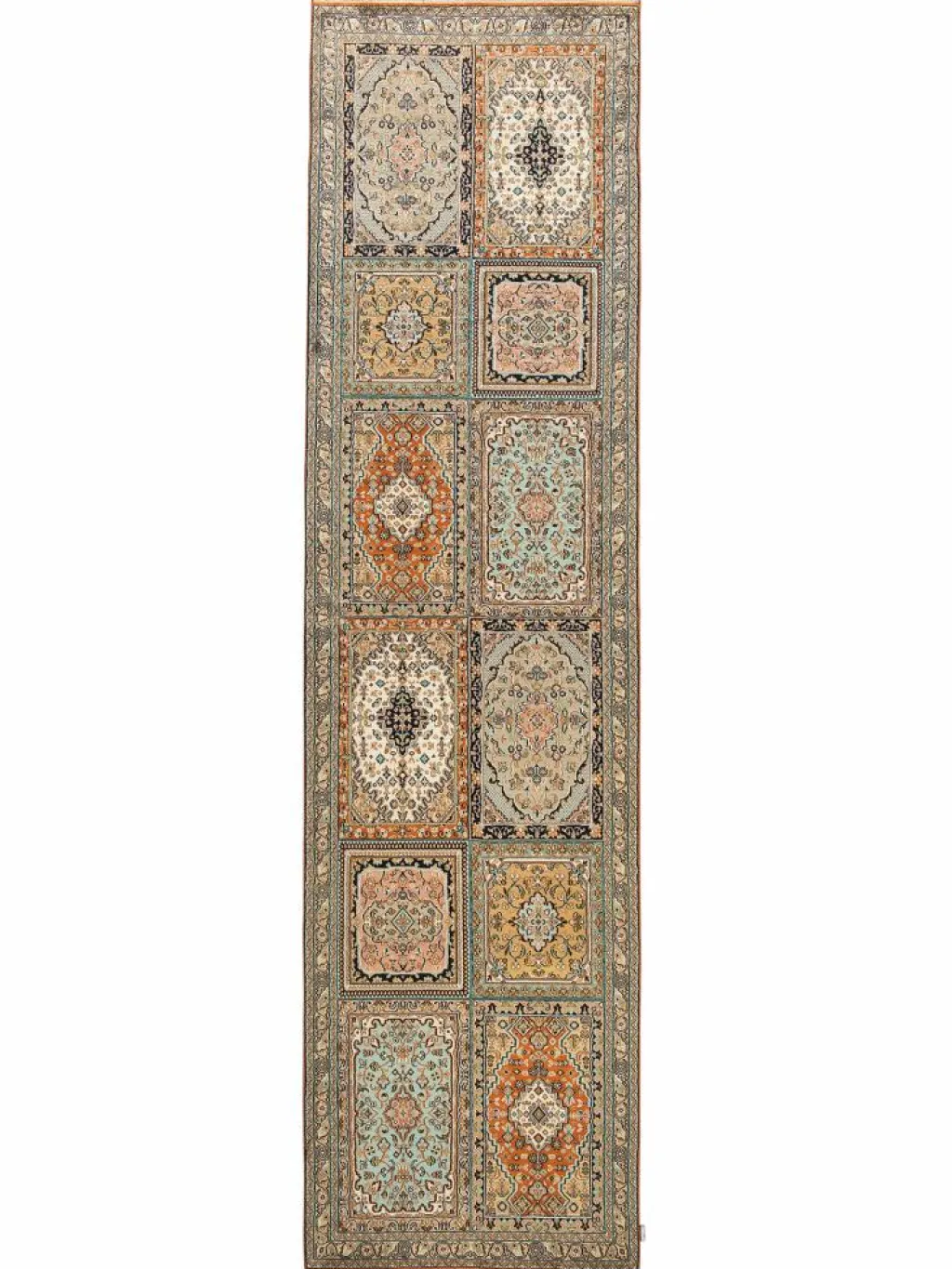 -Teppiche sind eher zurückhaltend, die Muster nach wie vor sehr stark persisch beeinflusst. Florale Motive und das persischeFeldermuster