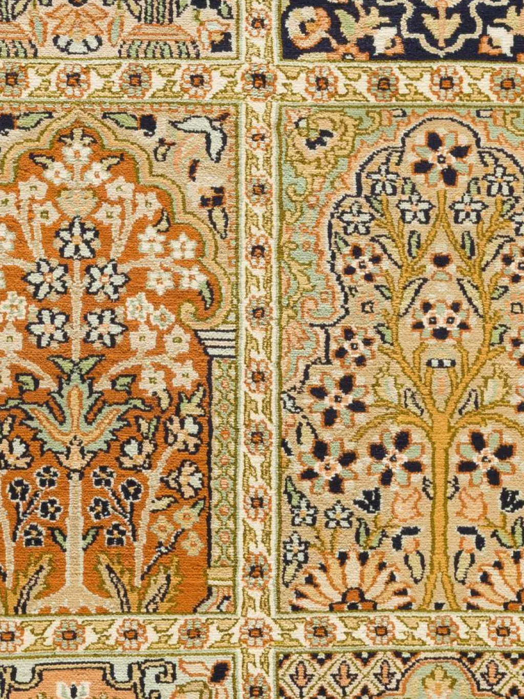 -Teppiche sind eher zurückhaltend, die Muster nach wie vor sehr stark persisch beeinflusst. Florale Motive und das persischeFeldermuster
