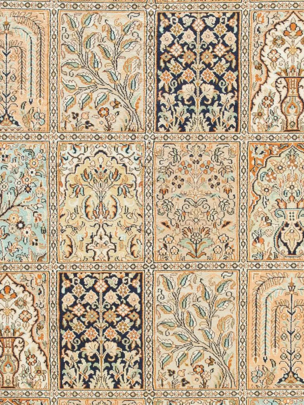 -Teppiche sind eher zurückhaltend, die Muster nach wie vor sehr stark persisch beeinflusst. Florale Motive und das persischeFeldermuster