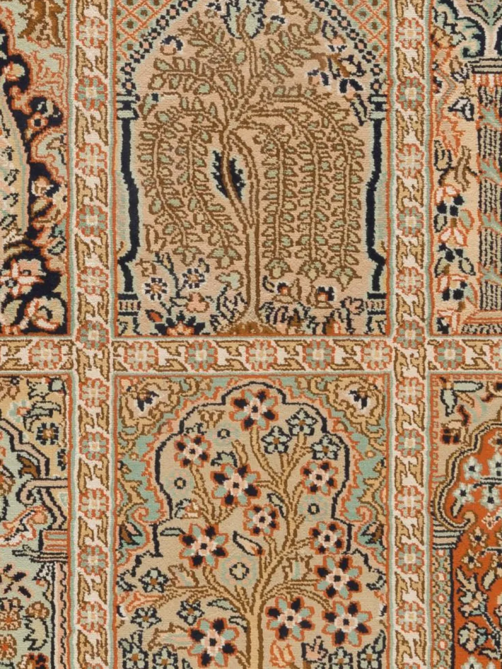 -Teppiche sind eher zurückhaltend, die Muster nach wie vor sehr stark persisch beeinflusst. Florale Motive und das persischeFeldermuster