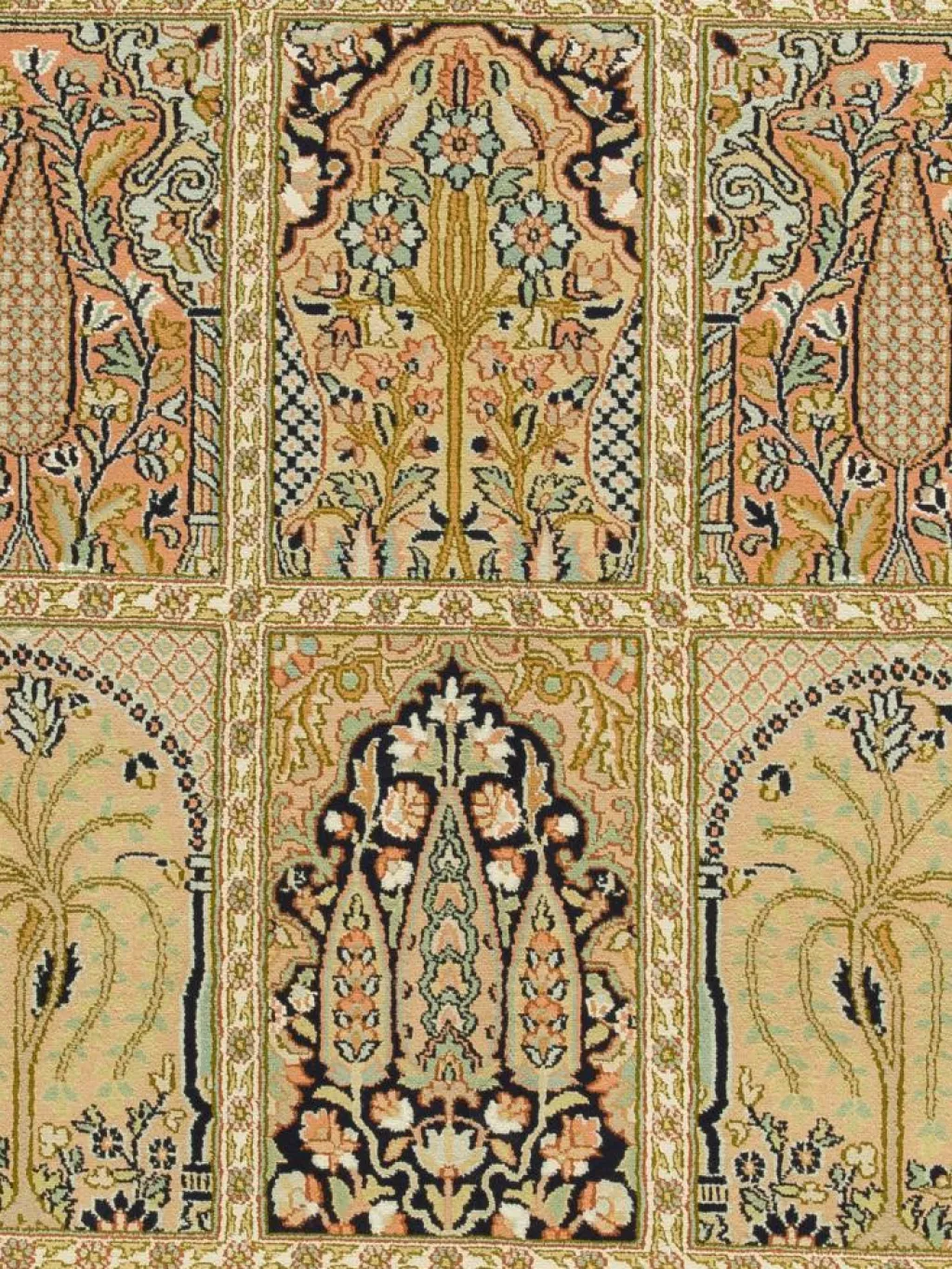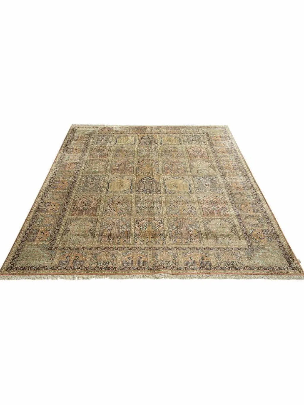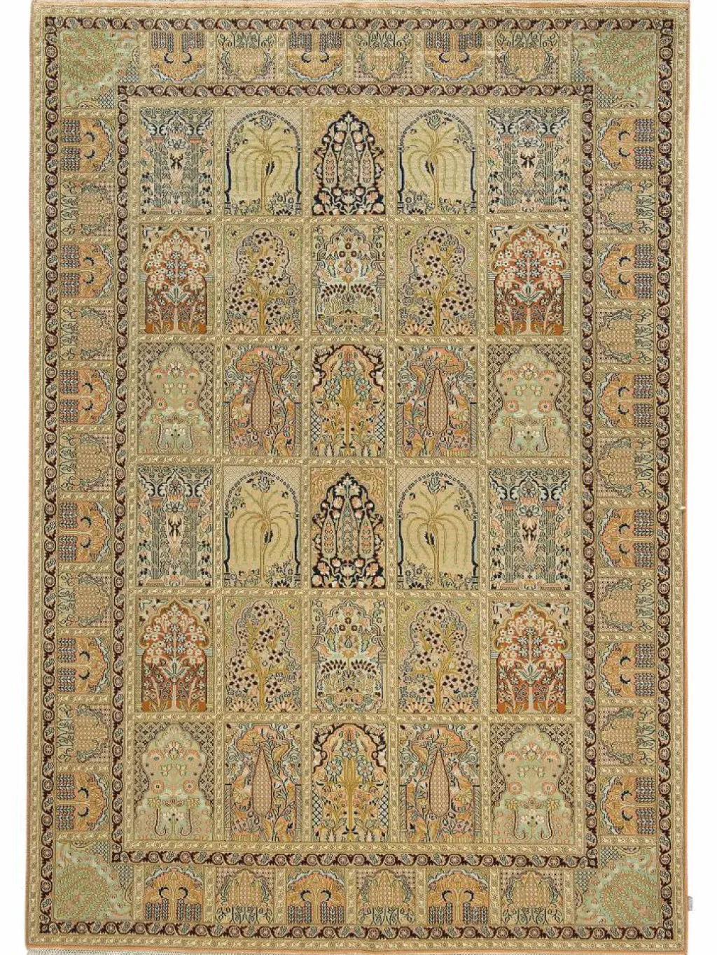 -Teppiche sind eher zurückhaltend, die Muster nach wie vor sehr stark persisch beeinflusst. Florale Motive und das persischeFeldermuster