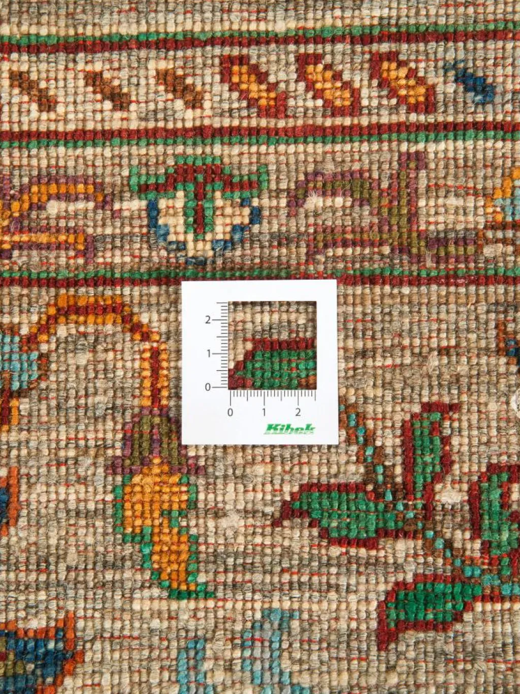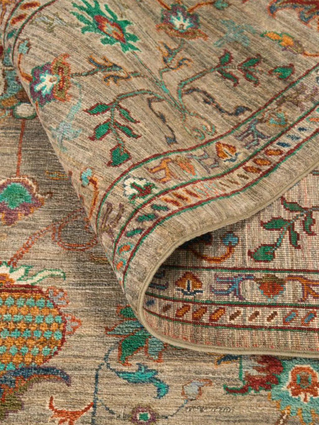 , einem klassischen Blütenmuster. Das Wort „Phool“ kommt aus der Pakistanischen Sprache Urdu und bedeutet „Blume“. Durch den flachen und festen Flor ist der Teppich unempfindlich gegenüber den Belastungen des Alltags. – Der Teppich wurde ausGhazni