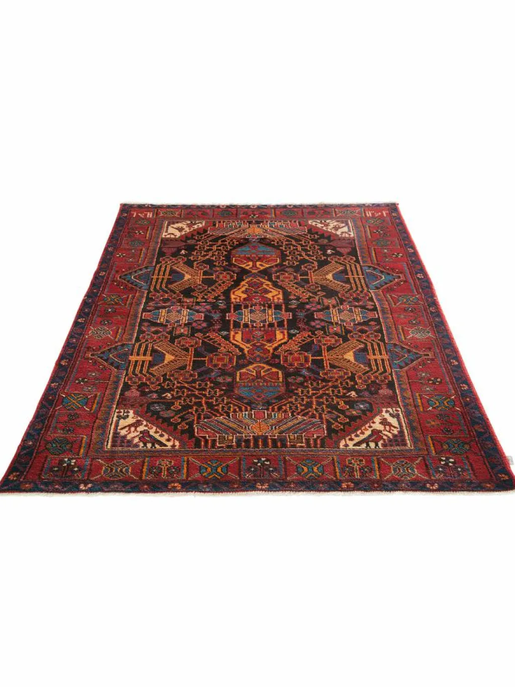 gehört zu den ältesten existierenden Städten Persiens. Der Flor ist relativ hoch und weich. Blüten, Blätter, Zweige und Vasen gruppieren sich in stark stilisierter Form um ein Mittelmedaillon.Die Gegend umHamadan