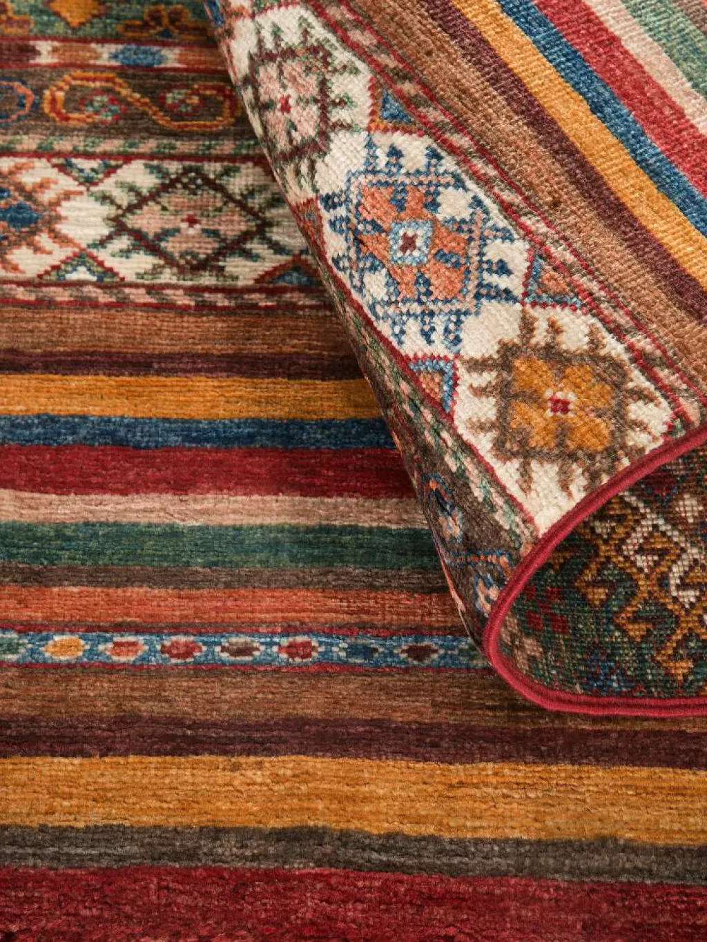 -Muster sind bunte Längsstreifen mit vielen verschiedenen Motiven gefüllt. Durch den flachen und festen Flor ist der Teppich unempfindlich gegenüber den Belastungen des Alltags.- Das Besondere an diesemOrientteppich