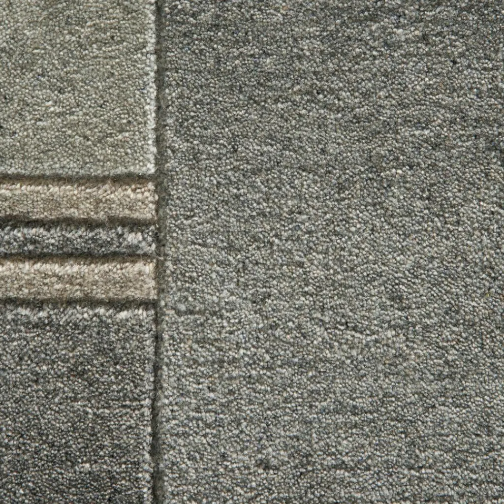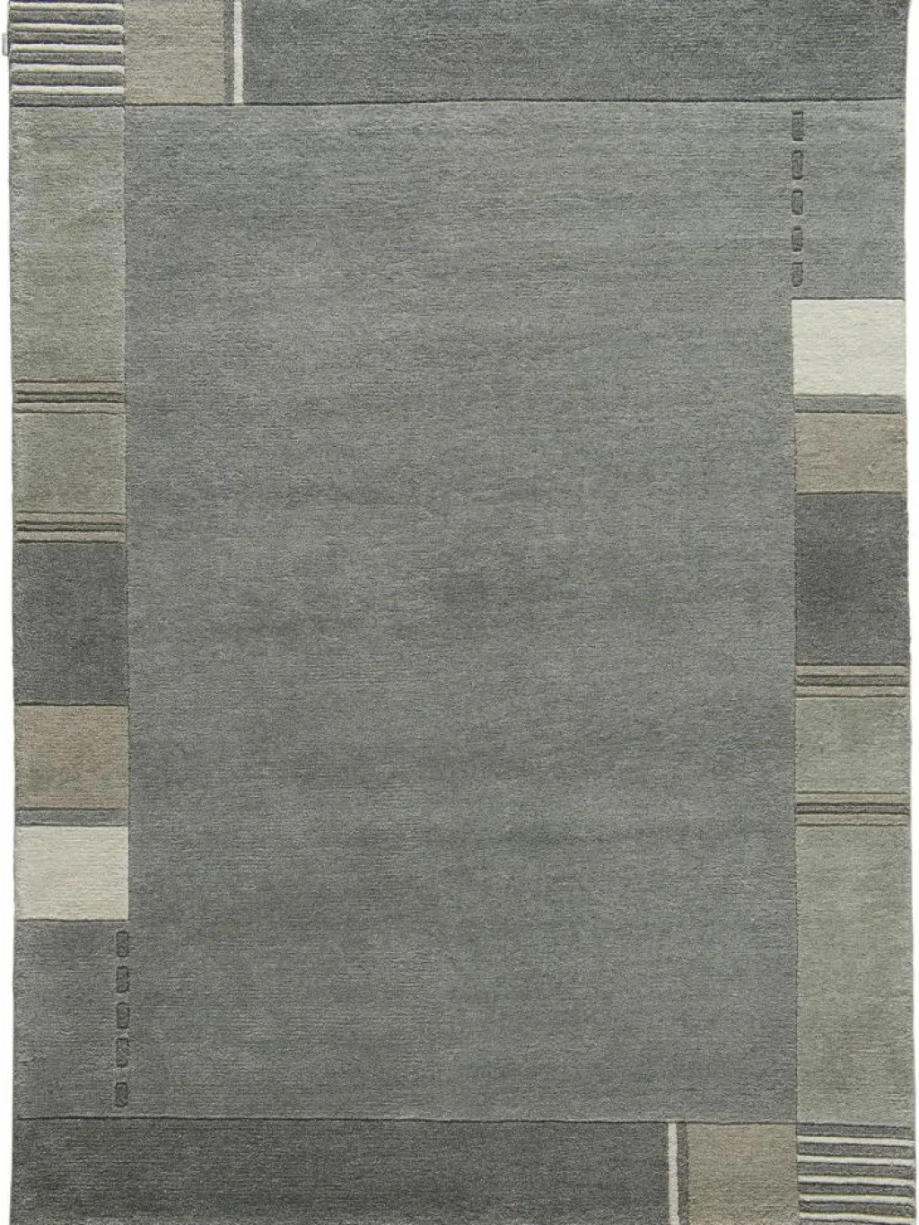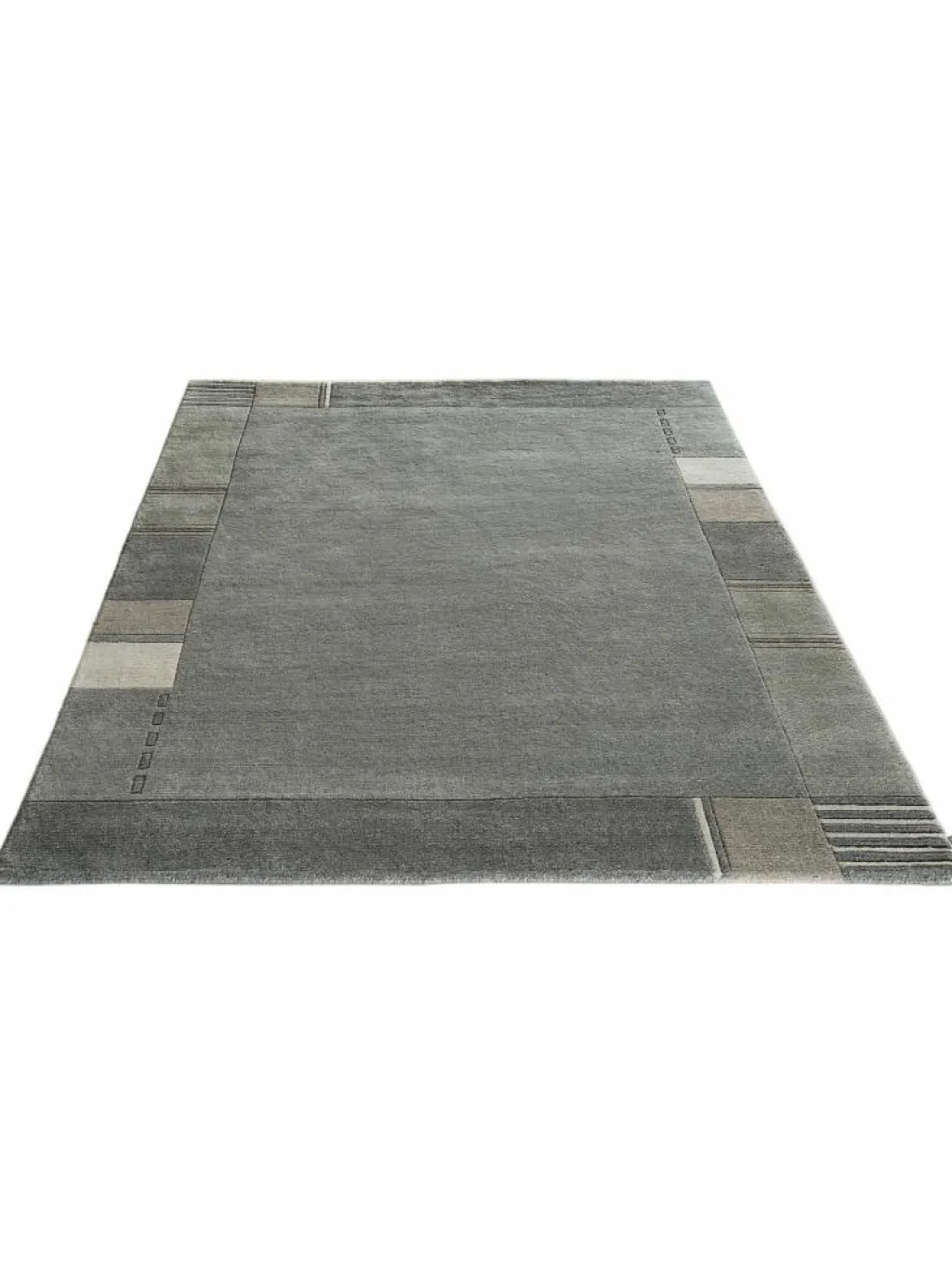 im Flor handgeknüpft. Die Trennung zwischen den Mustern ist akurat ausgearbeitet und von Hand konturgeschnitten. In der Einfassung wurde zur Verstärkung ein Kettfaden eingenäht und anschließend mit farblich passendem Garn ummantelt.| Art: | Nepal -Teppich |