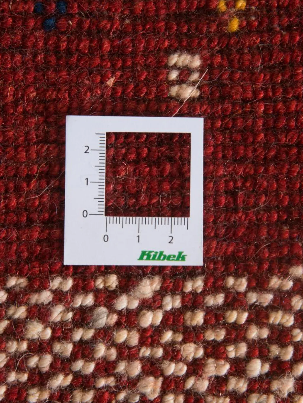 . Die Schur ist relativ hoch, der Griff fest. Die Muster sind meist schlicht oder eine Kombination mit traditionellen Mustern. Mustervorlagen gibt es nicht. Geknüpft werden alle Muster aus dem Kopf.| Gesamthöhe: | ca. 19 mm |