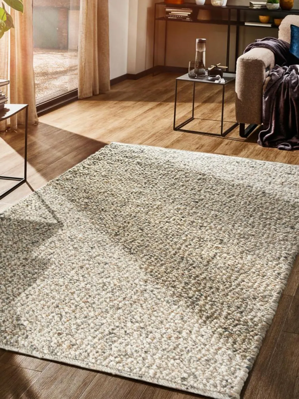 ). Diese Struktur in Verbindung mit fein abgestuften Naturtönen zeichnen den von Hand gewebten Teppich aus, wobei seine natürliche Melierung das Design nochmal verstärkt und hervorhebt. Er verschönert den Raum und vermittelt durch seine natürlichen Materialien ein Gefühl von Wärme und Gemütlichkeit. Dank seiner qualitativ hochwertigen Materialien und des natürlichen Fettgehalts derWolle
