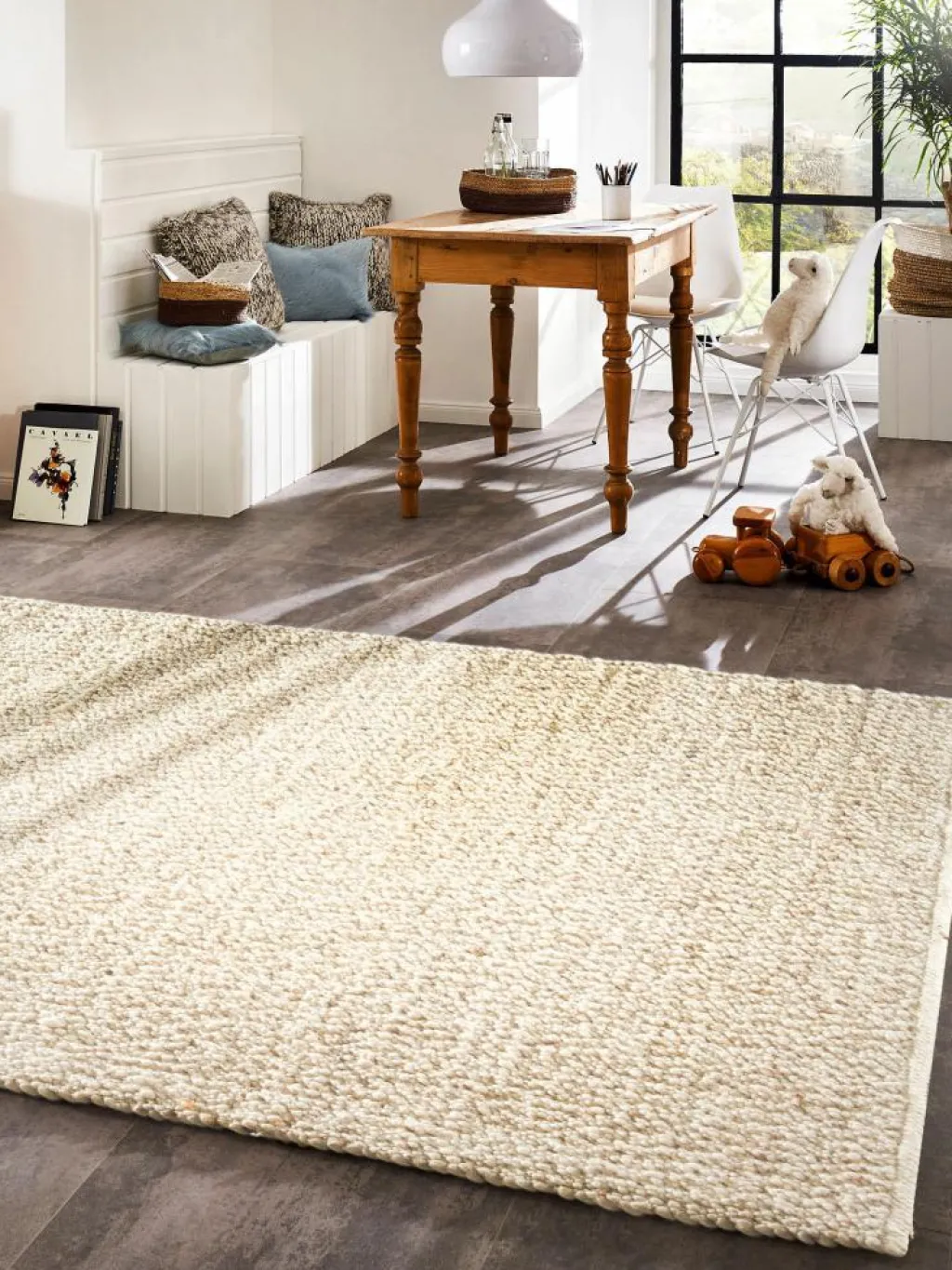 ). Diese Struktur in Verbindung mit fein abgestuften Naturtönen zeichnen den von Hand gewebten Teppich aus, wobei seine natürliche Melierung das Design nochmal verstärkt und hervorhebt. Er verschönert den Raum und vermittelt durch seine natürlichen Materialien ein Gefühl von Wärme und Gemütlichkeit. Dank seiner qualitativ hochwertigen Materialien und des natürlichen Fettgehalts derWolle