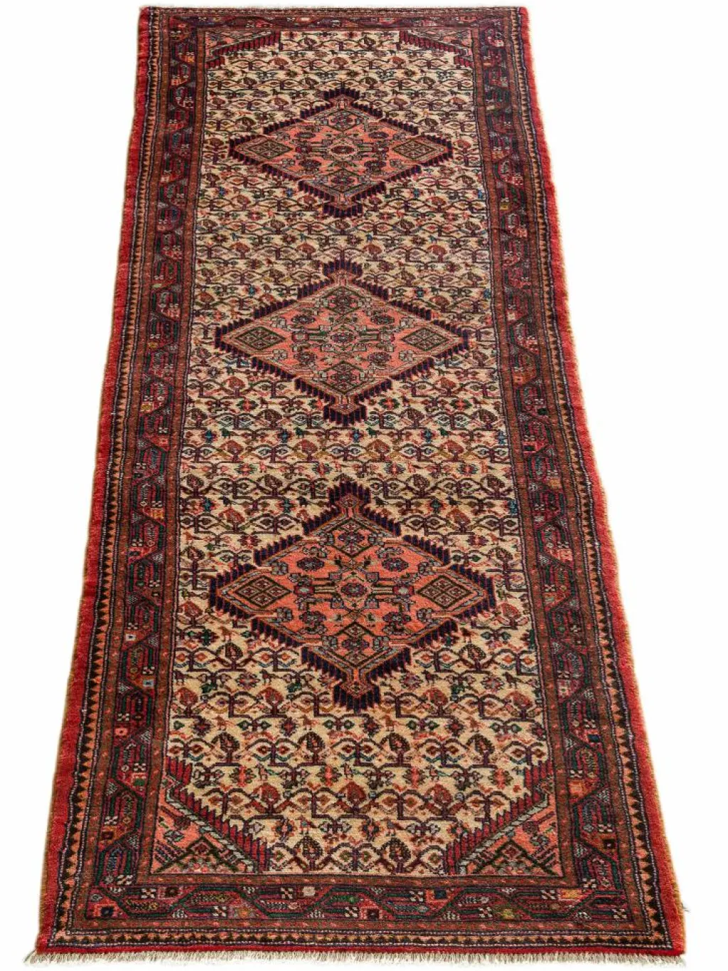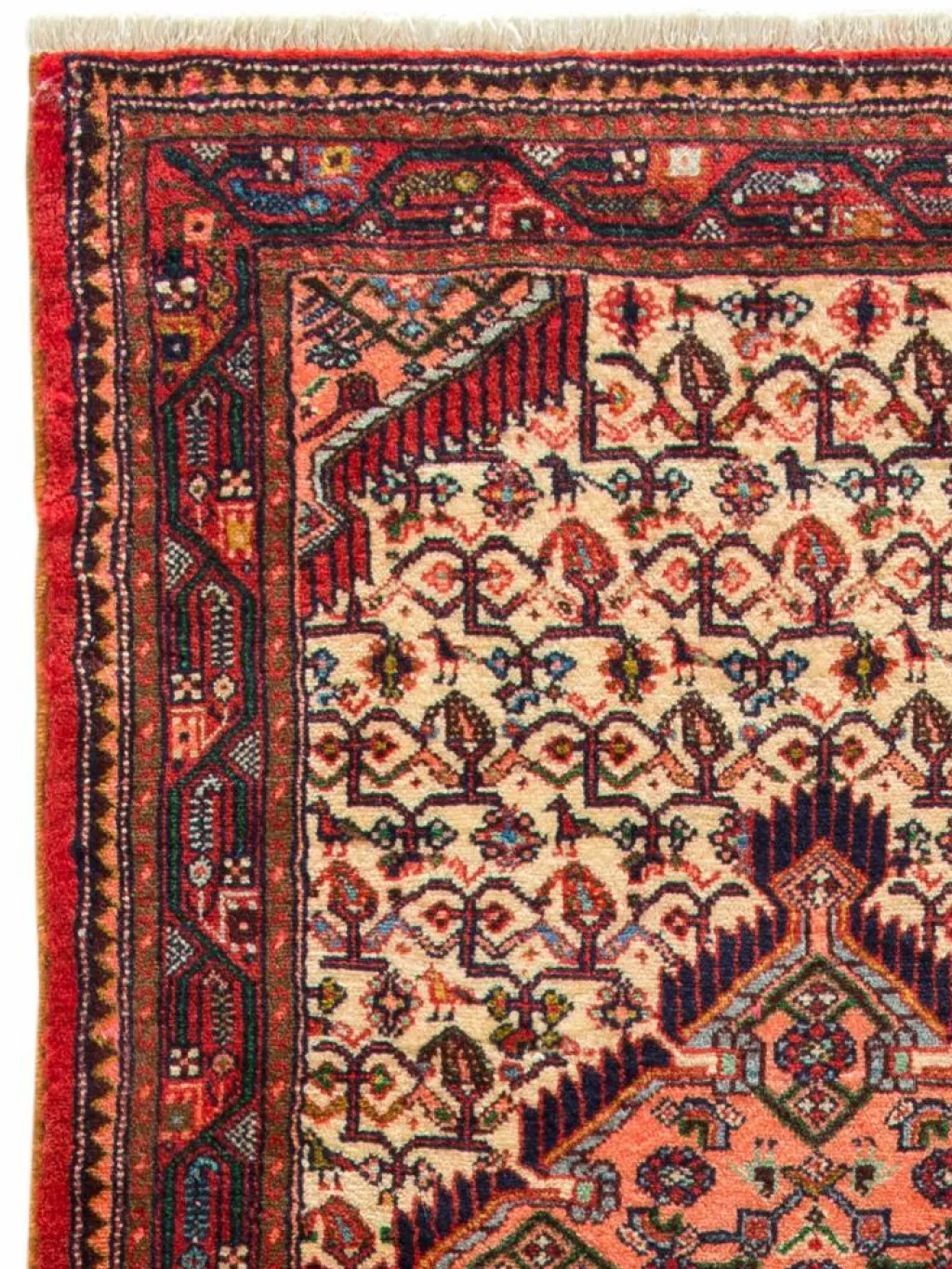 . Die Farben des Teppichs sind warm. Die Muster sind charakteristisch: Das Innenfeld ist mit einemMahi