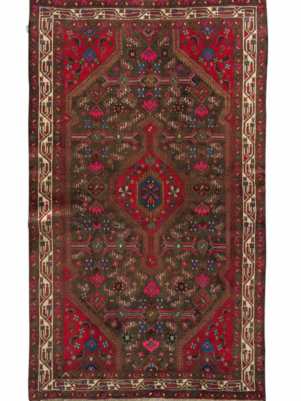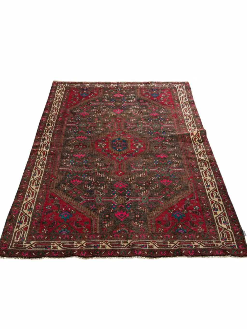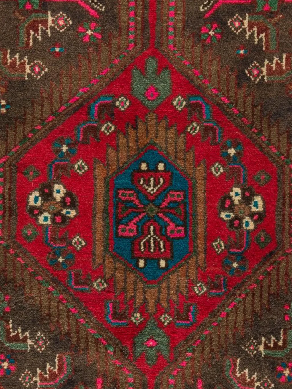 . Die Farben des Teppichs sind warm. Die Muster sind charakteristisch: Das Innenfeld ist mit einemMahi