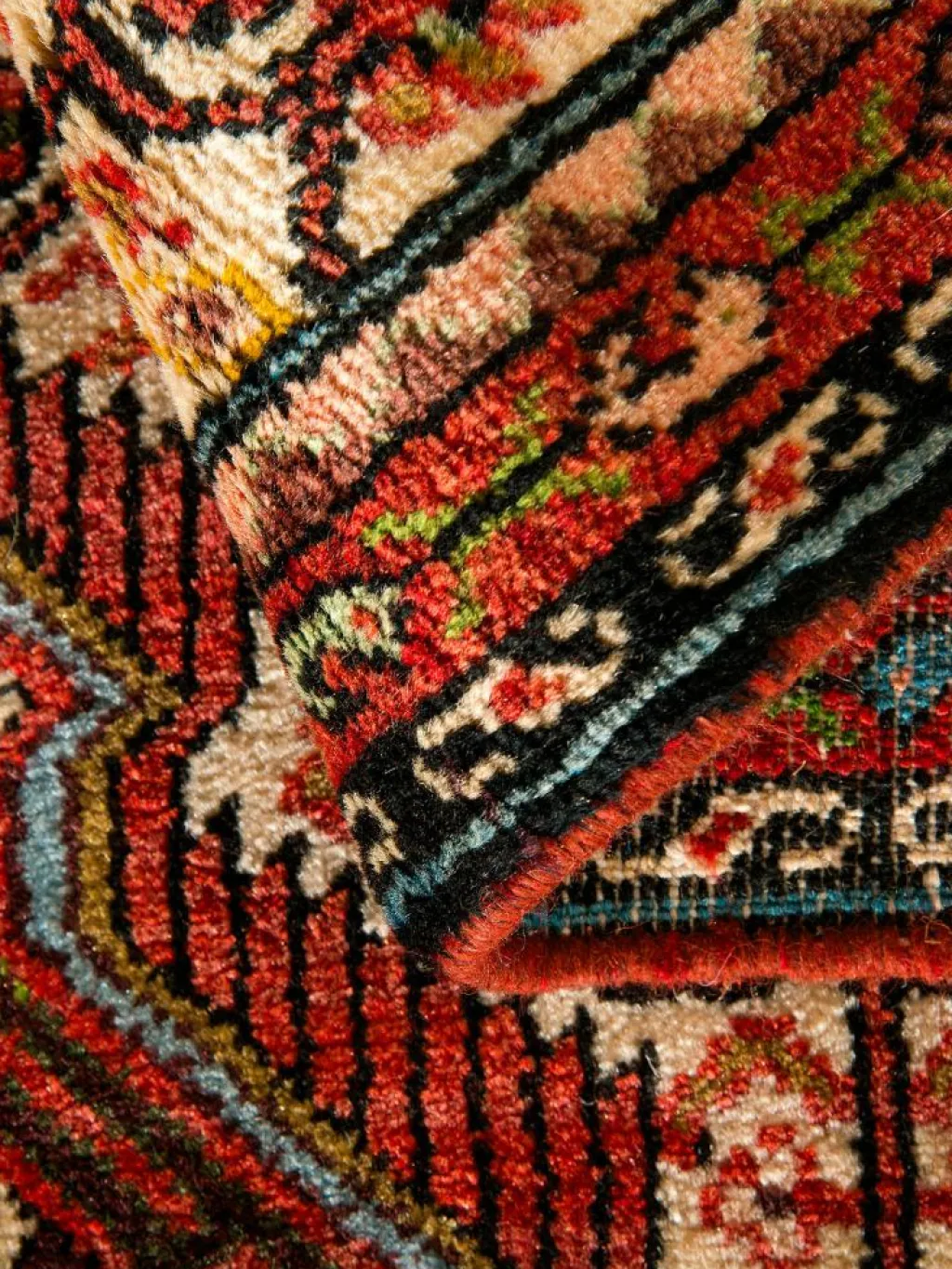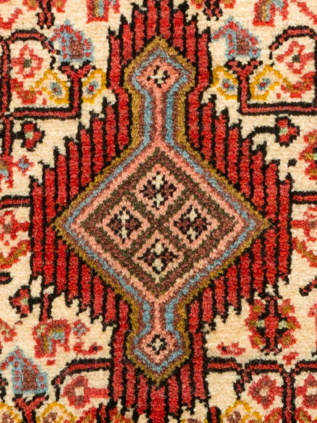 . Die Farben des Teppichs sind warm. Die Muster sind charakteristisch: Das Innenfeld ist mit einemMahi