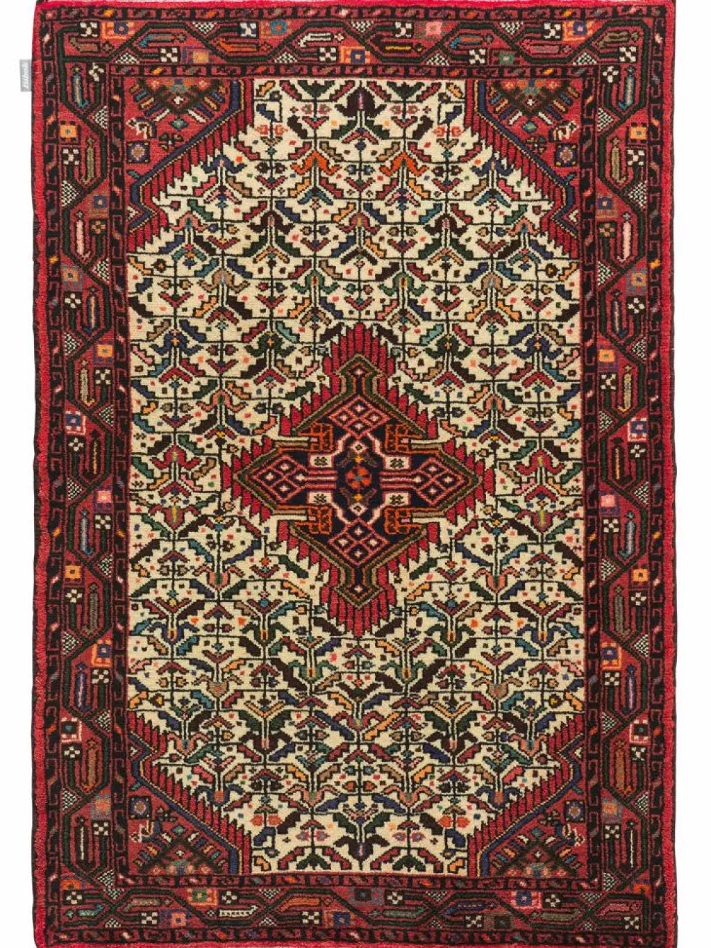 . Die Farben des Teppichs sind warm. Die Muster sind charakteristisch: Das Innenfeld ist mit einemMahi