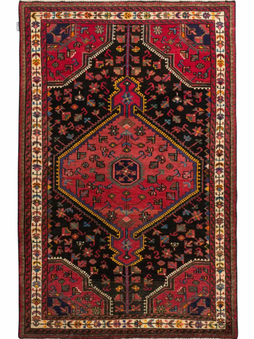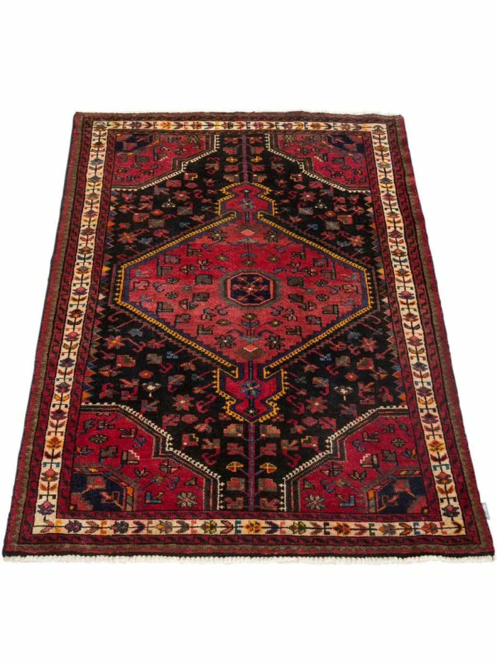 -Gebiets. Hier werden robuste Teppiche geknüpft. Charakteristisch ist ein beigefarbener oder schwarzer Grund, wenig gemustert, von dem sich das typische hexagonale Mittelmedaillon stark abhebt.Die Gegend umHamadan