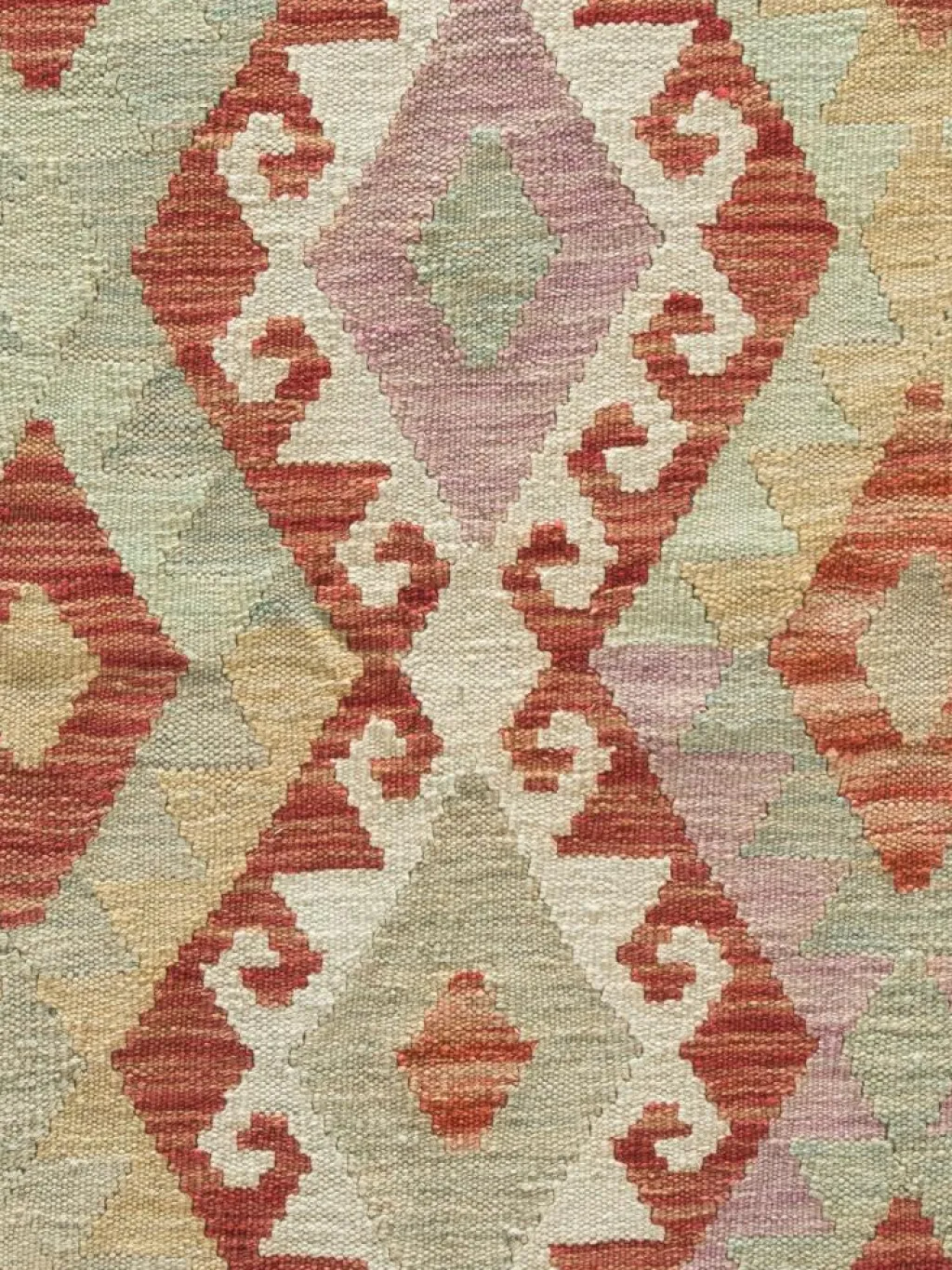 gehört zu den Schlitzkelims. Beim Schlitzkelim entsteht das Muster durch das farbige Schussmaterial, das bei einem Farbwechsel wieder zurück geführt wird. Dadurch entsteht ein sichtbarer Schlitz. Die Fadenenden werden eingearbeitet und sind nicht zu sehen. Durch diese Webart ist der AfghanKelim