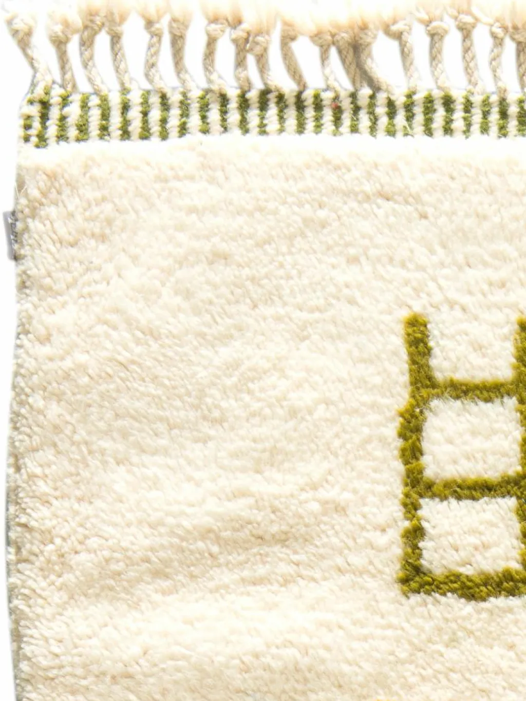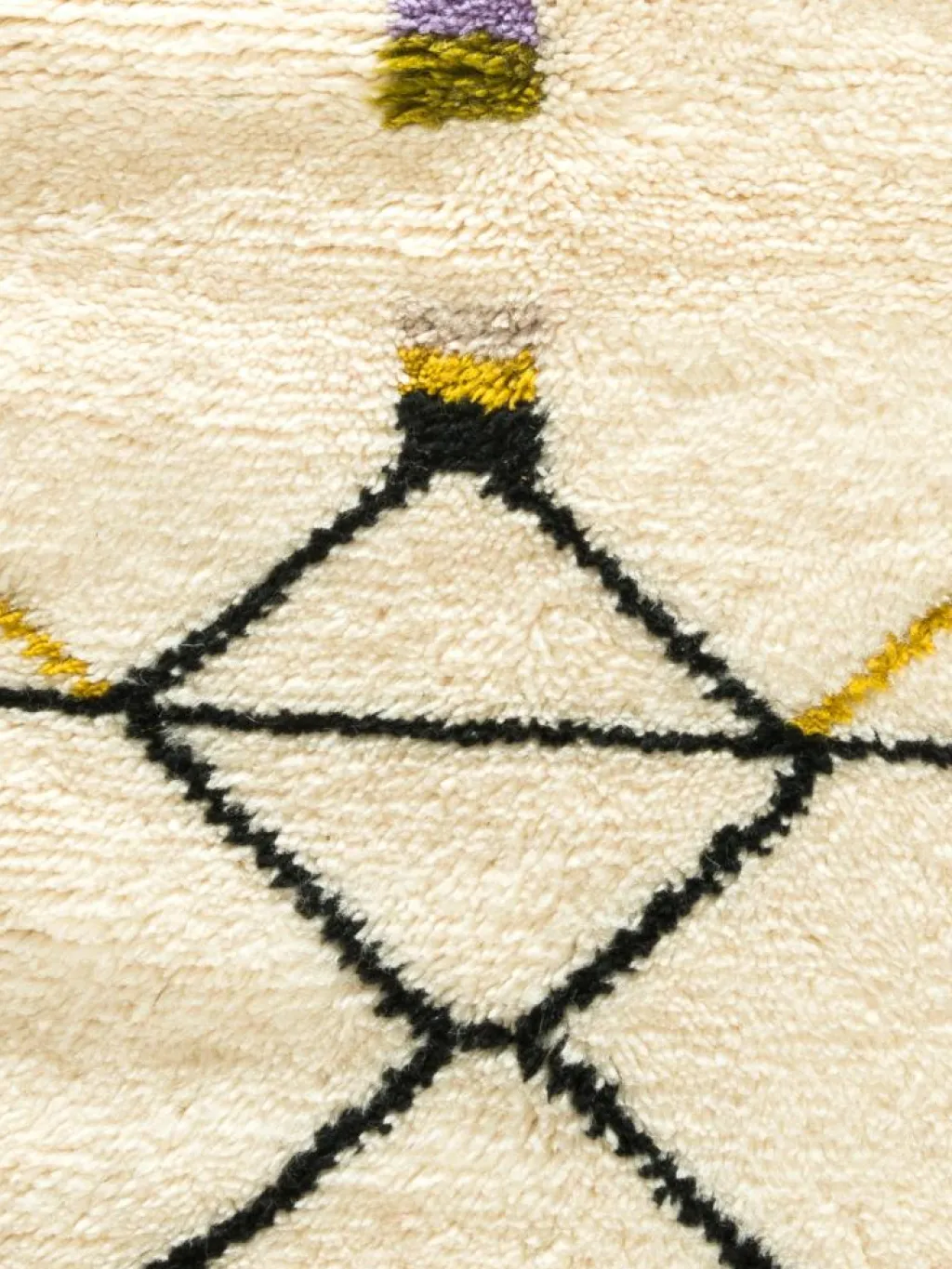 . Die Teppiche sind fast immer weißgrundig und zeichnen sich durch schwarze Zickzack-, Gitter- oder Rauten-Muster sowie einem wohnlich-zotteligen Flor aus. Kaum eine andere Teppichprovenienz passt mit ihren ursprünglichen nomadischen Designs besser in einen minimalistischen Wohnstil. Wie viele andere Nomadenteppiche auch, wurden dieBeni Ourain