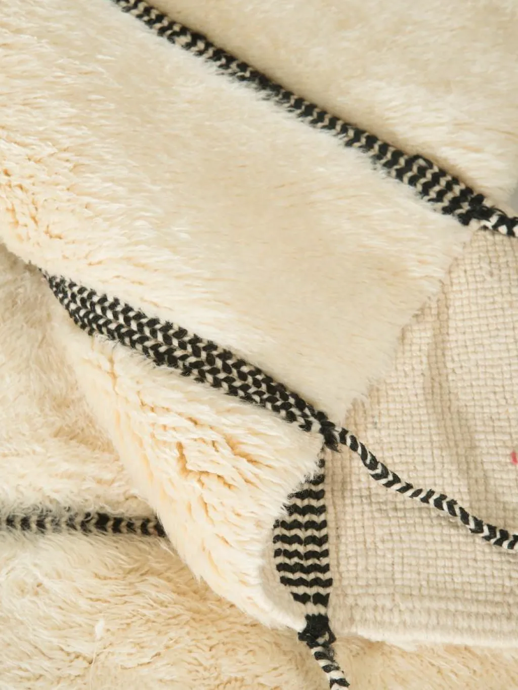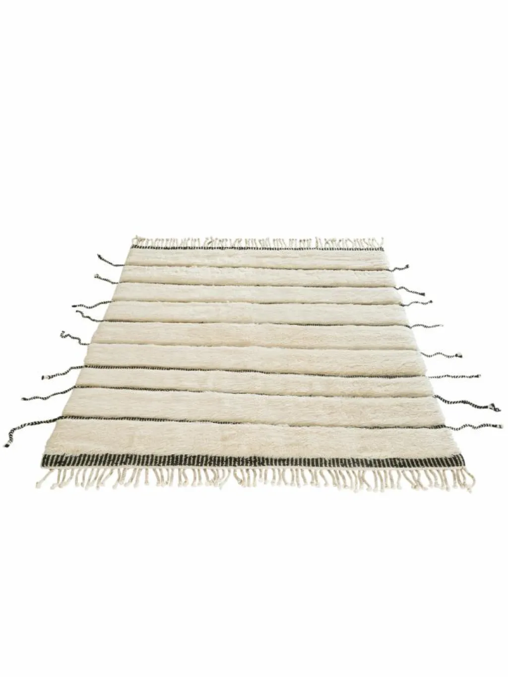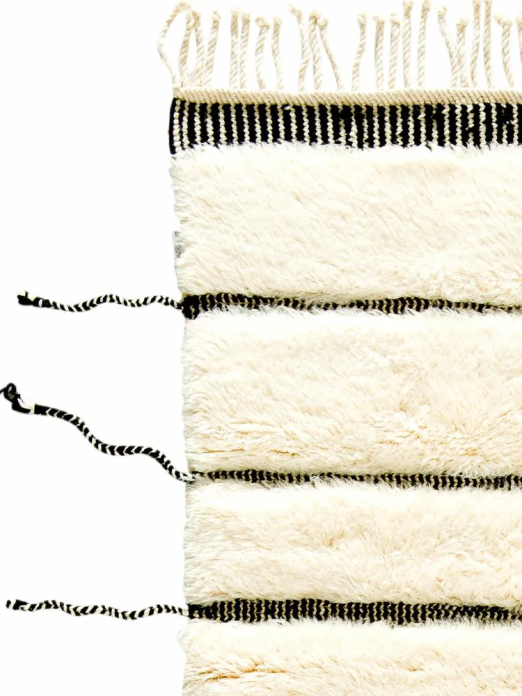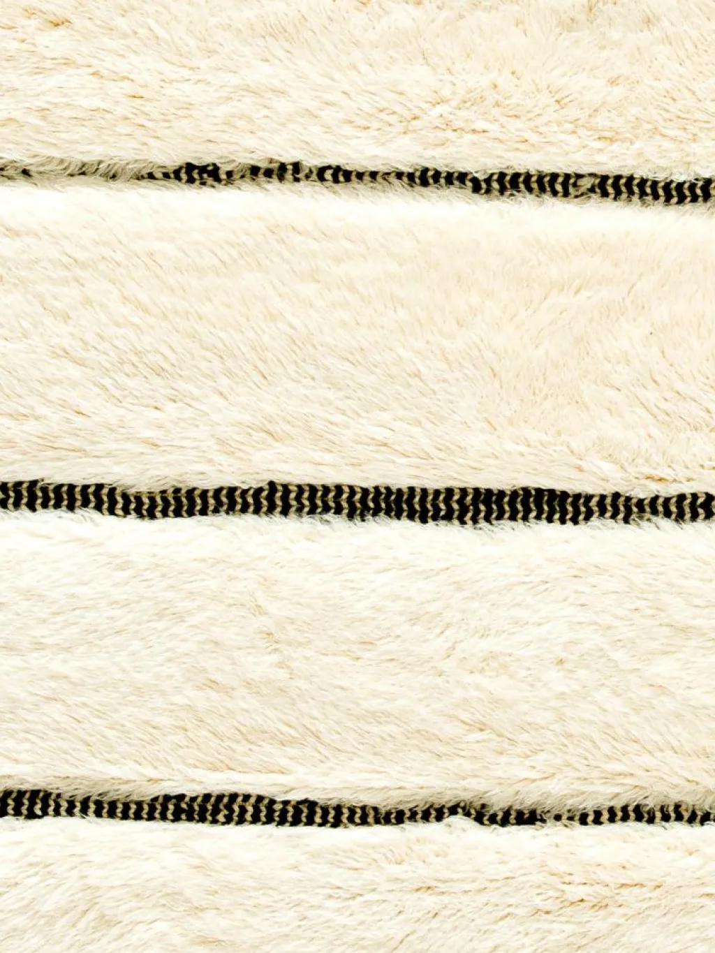 . Die Teppiche sind fast immer weißgrundig und zeichnen sich durch schwarze Zickzack-, Gitter- oder Rauten-Muster sowie einem wohnlich-zotteligen Flor aus. Kaum eine andere Teppichprovenienz passt mit ihren ursprünglichen nomadischen Designs besser in einen minimalistischen Wohnstil. Wie viele andere Nomadenteppiche auch, wurden dieBeni Ourain