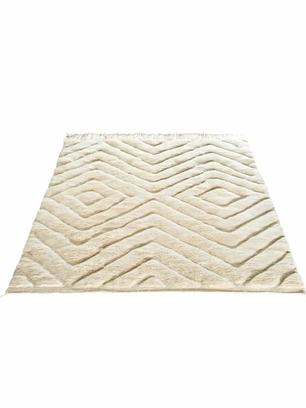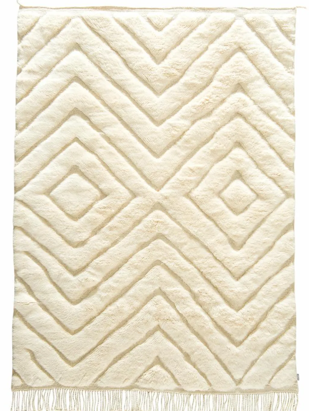 . Die Teppiche sind fast immer weißgrundig und zeichnen sich durch schwarze Zickzack-, Gitter- oder Rauten-Muster sowie einem wohnlich-zotteligen Flor aus. Kaum eine andere Teppichprovenienz passt mit ihren ursprünglichen nomadischen Designs besser in einen minimalistischen Wohnstil. Wie viele andere Nomadenteppiche auch, wurden dieBeni Ourain