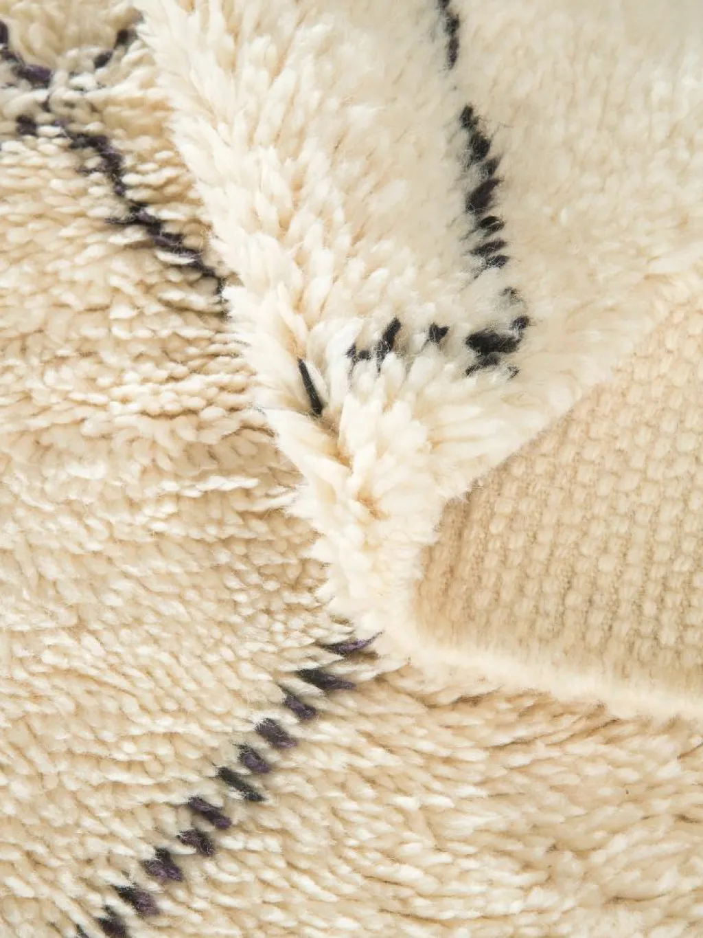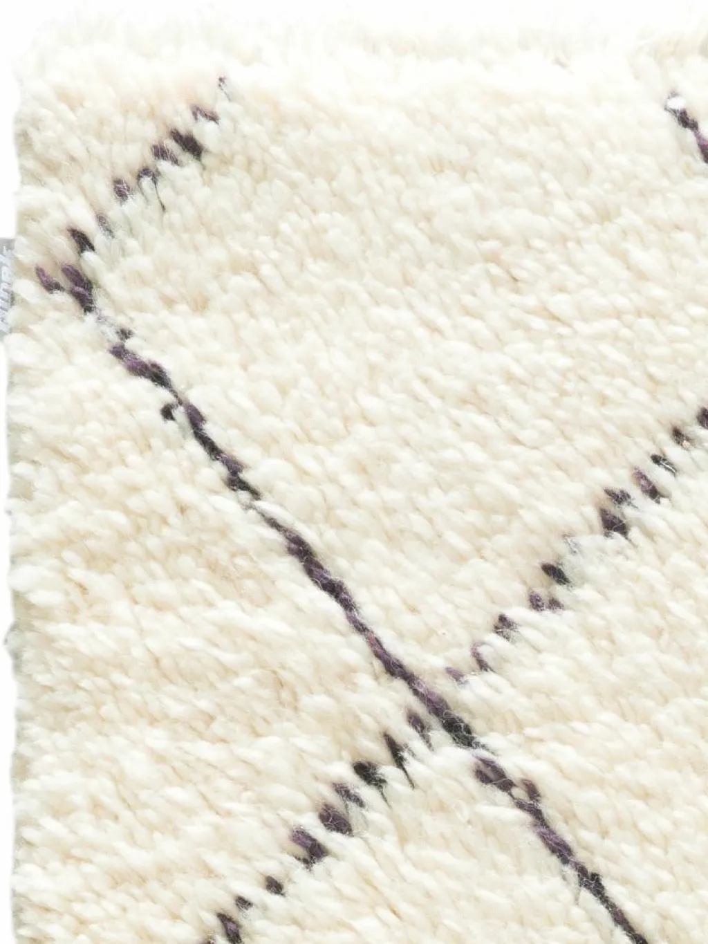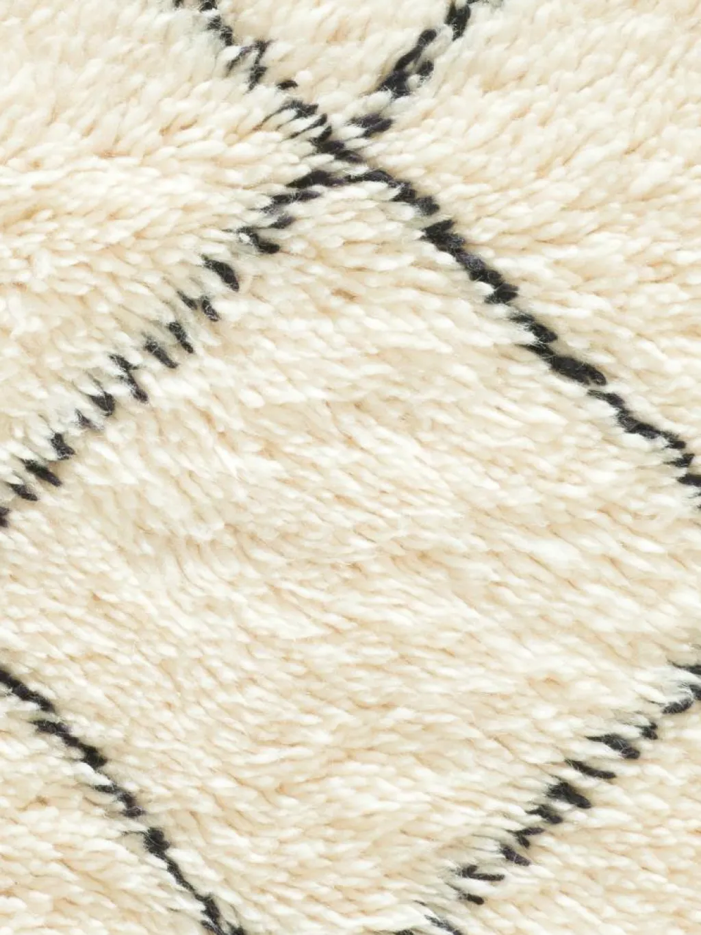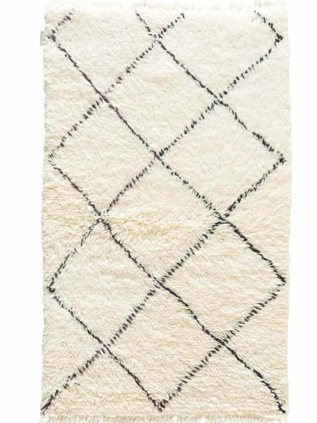 . Die Teppiche sind fast immer weißgrundig und zeichnen sich durch schwarze Zickzack-, Gitter- oder Rauten-Muster sowie einem wohnlich-zotteligen Flor aus. Kaum eine andere Teppichprovenienz passt mit ihren ursprünglichen nomadischen Designs besser in einen minimalistischen Wohnstil. Wie viele andere Nomadenteppiche auch, wurden dieBeni Ourain