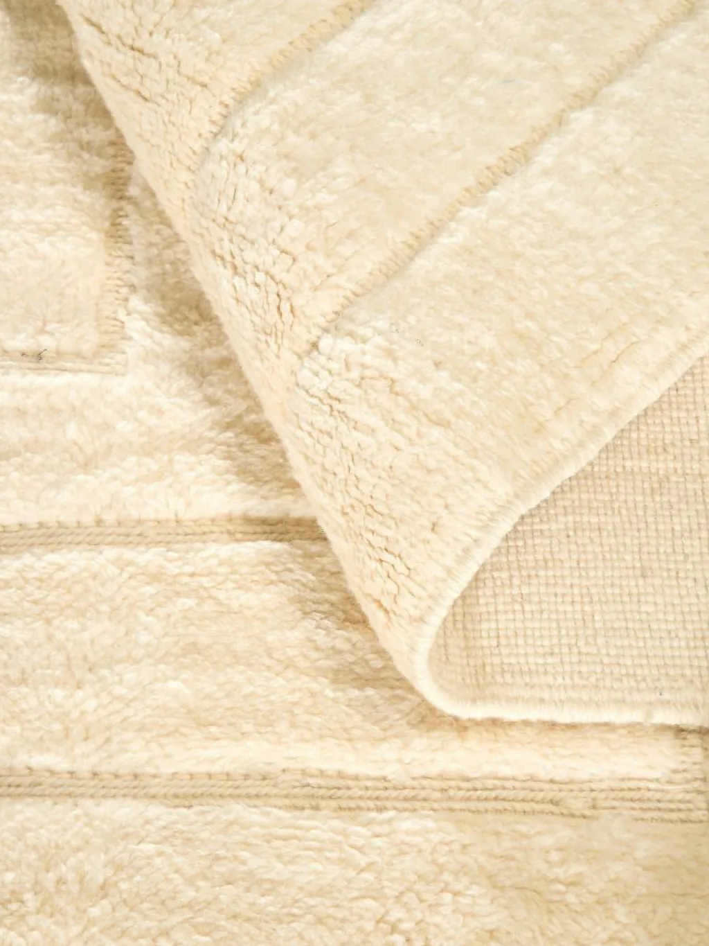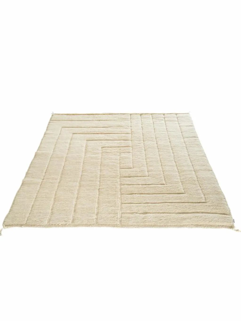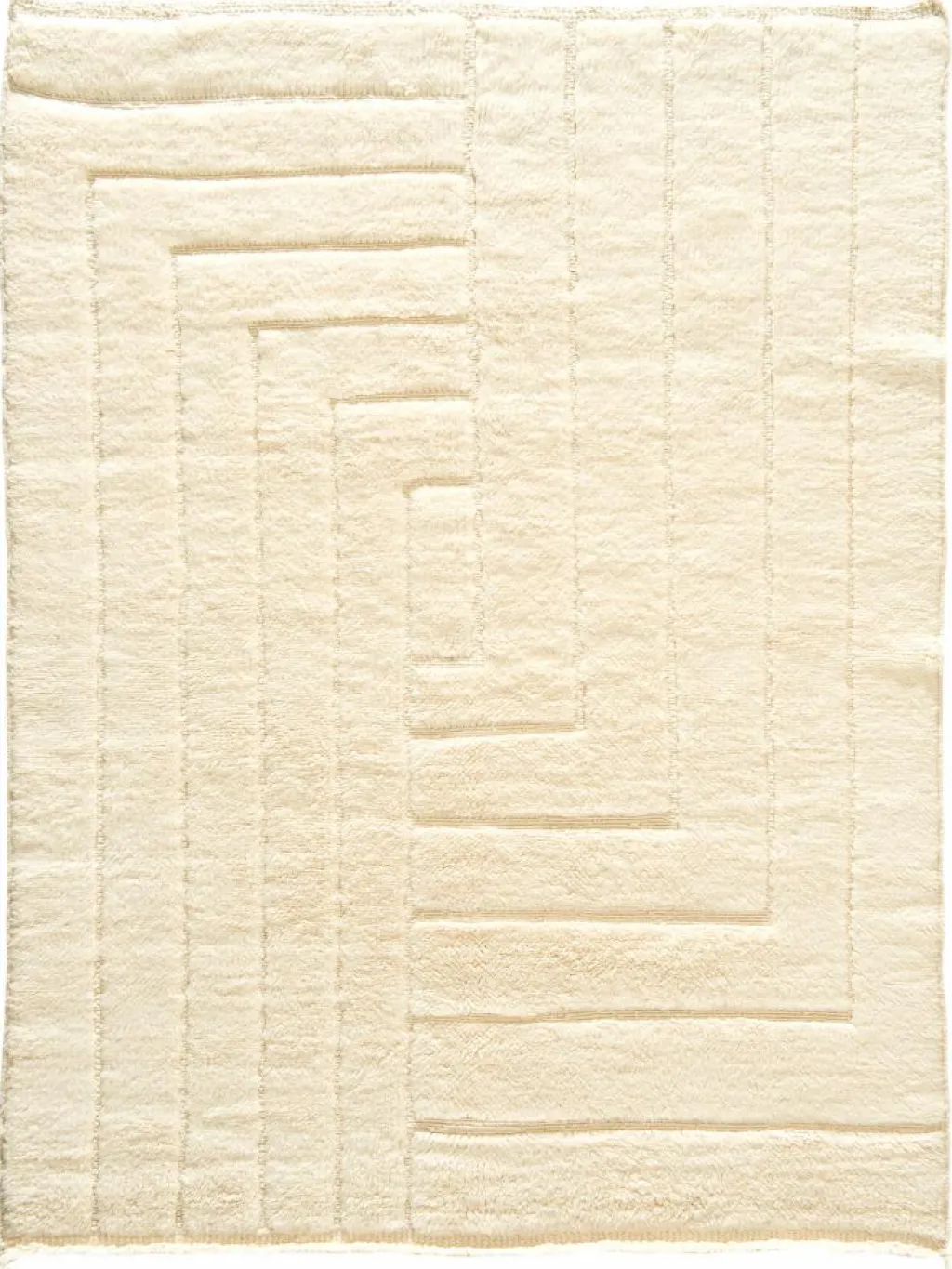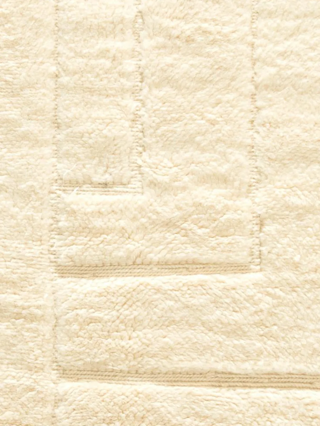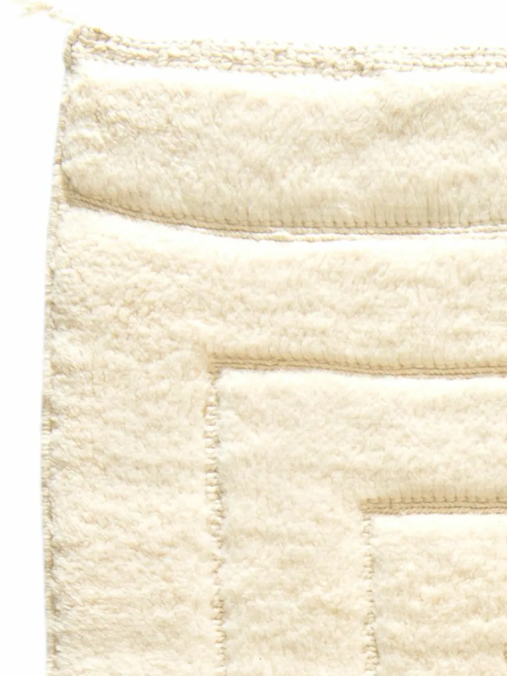 . Die Teppiche sind fast immer weißgrundig und zeichnen sich durch schwarze Zickzack-, Gitter- oder Rauten-Muster sowie einem wohnlich-zotteligen Flor aus. Kaum eine andere Teppichprovenienz passt mit ihren ursprünglichen nomadischen Designs besser in einen minimalistischen Wohnstil. Wie viele andere Nomadenteppiche auch, wurden dieBeni Ourain