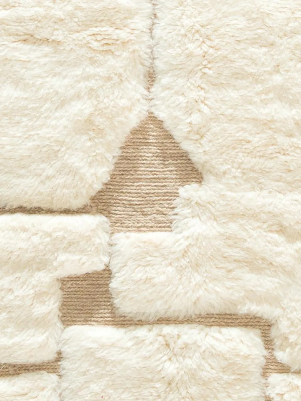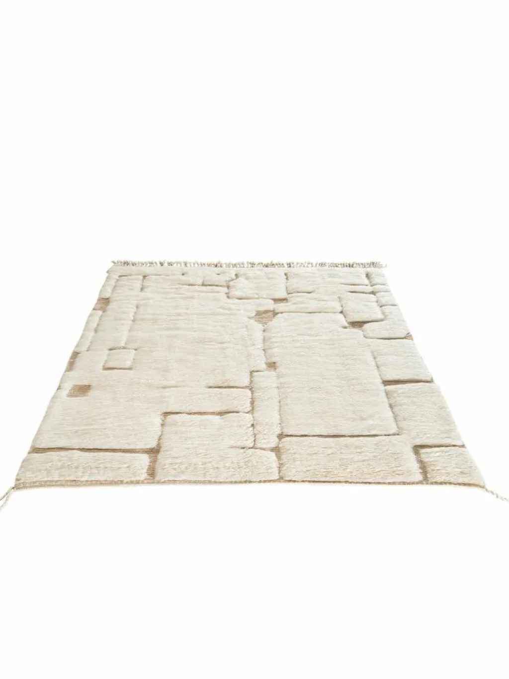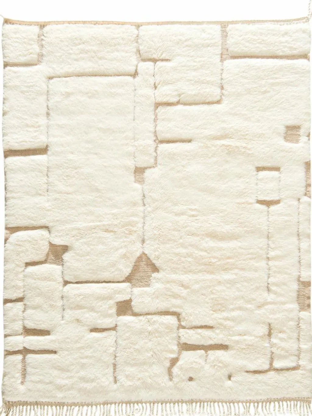. Die Teppiche sind fast immer weißgrundig und zeichnen sich durch schwarze Zickzack-, Gitter- oder Rauten-Muster sowie einem wohnlich-zotteligen Flor aus. Kaum eine andere Teppichprovenienz passt mit ihren ursprünglichen nomadischen Designs besser in einen minimalistischen Wohnstil. Wie viele andere Nomadenteppiche auch, wurden dieBeni Ourain