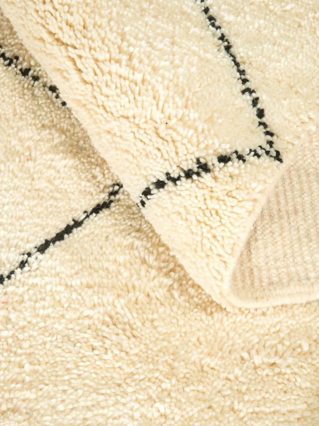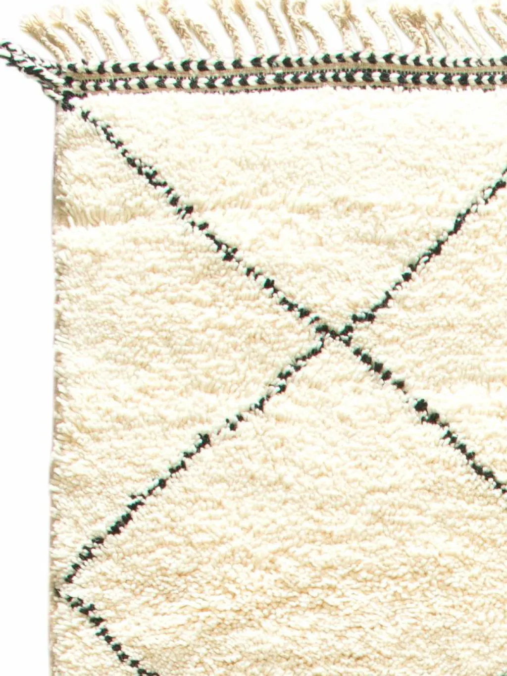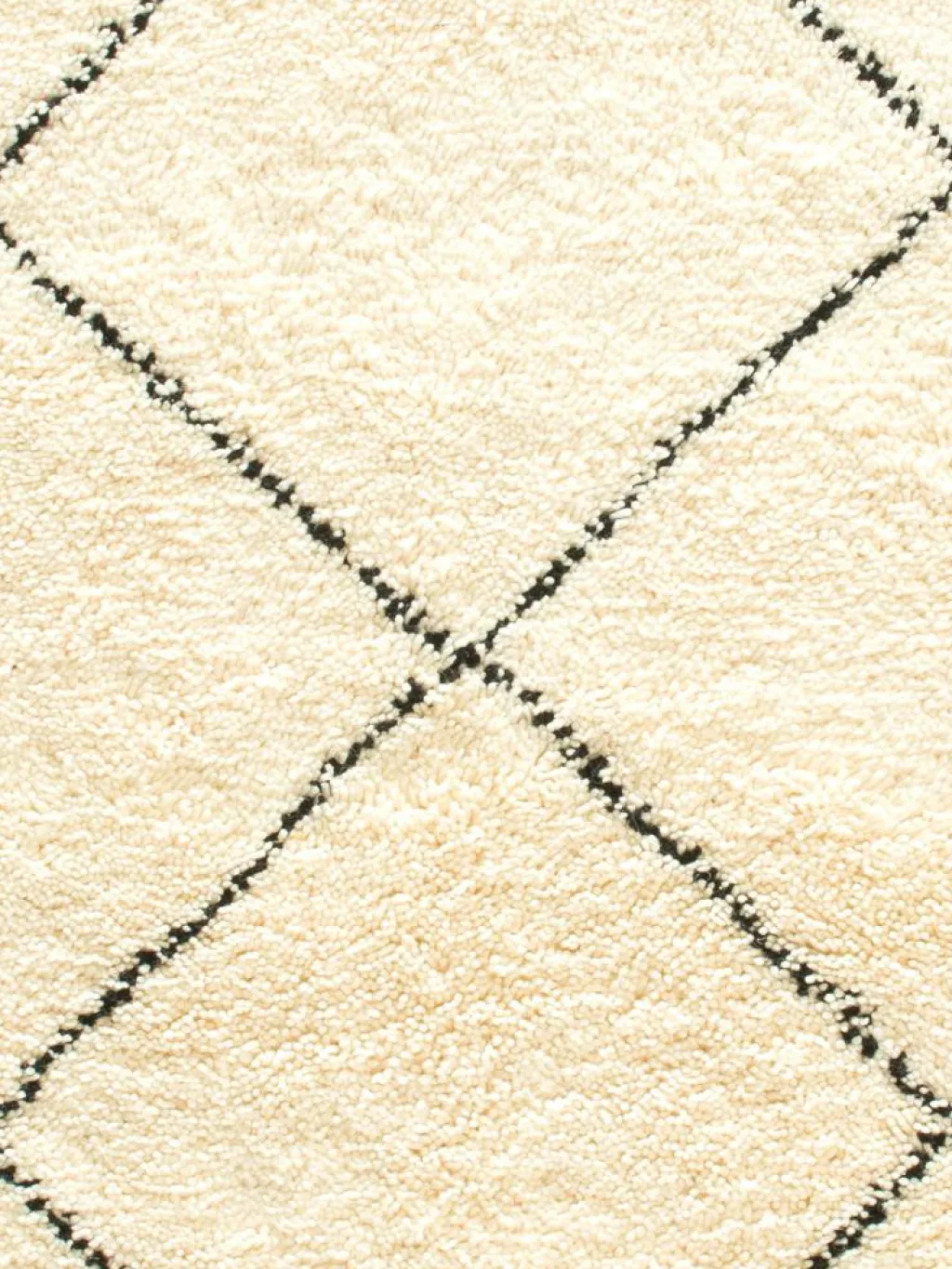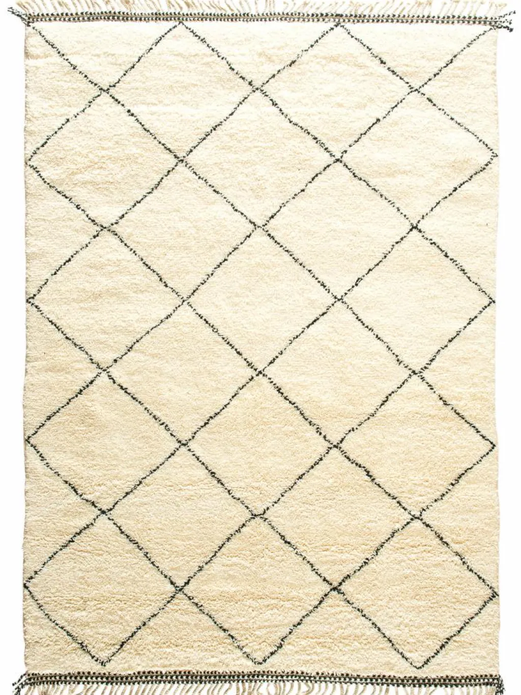 . Die Teppiche sind fast immer weißgrundig und zeichnen sich durch schwarze Zickzack-, Gitter- oder Rauten-Muster sowie einem wohnlich-zotteligen Flor aus. Kaum eine andere Teppichprovenienz passt mit ihren ursprünglichen nomadischen Designs besser in einen minimalistischen Wohnstil. Wie viele andere Nomadenteppiche auch, wurden dieBeni Ourain
