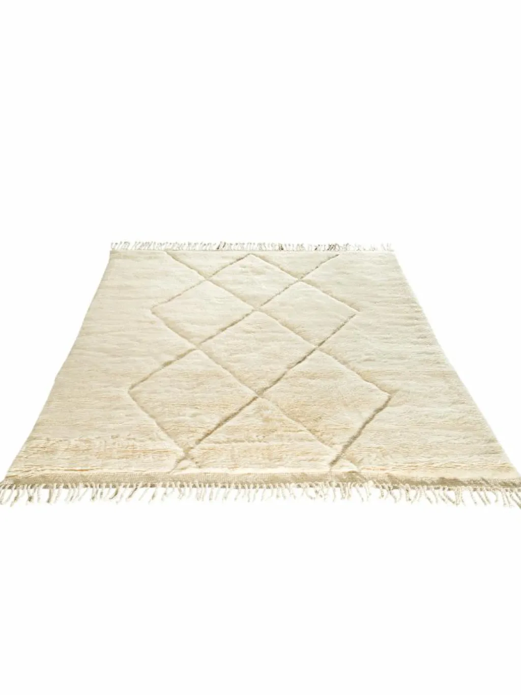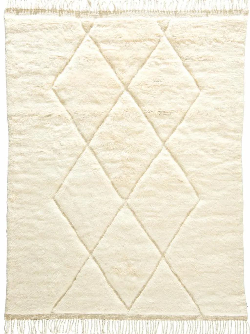 . Die Teppiche sind fast immer weißgrundig und zeichnen sich durch schwarze Zickzack-, Gitter- oder Rauten-Muster sowie einem wohnlich-zotteligen Flor aus. Kaum eine andere Teppichprovenienz passt mit ihren ursprünglichen nomadischen Designs besser in einen minimalistischen Wohnstil. Wie viele andere Nomadenteppiche auch, wurden dieBeni Ourain