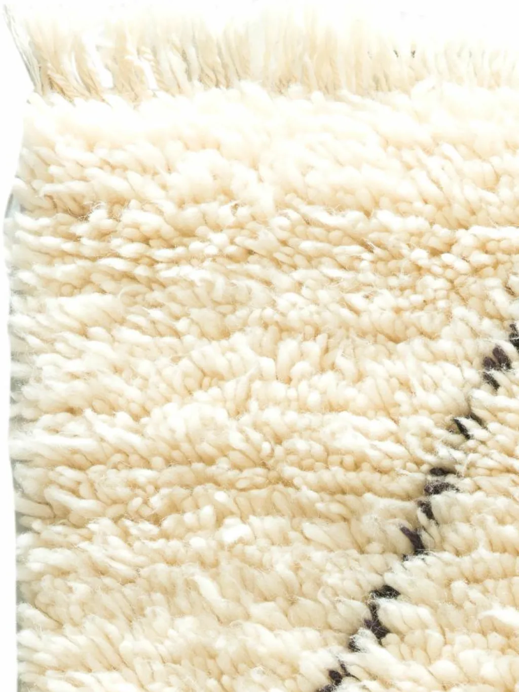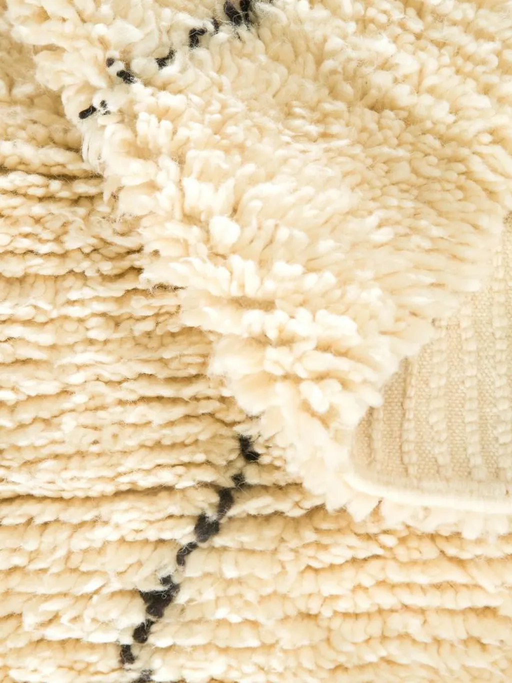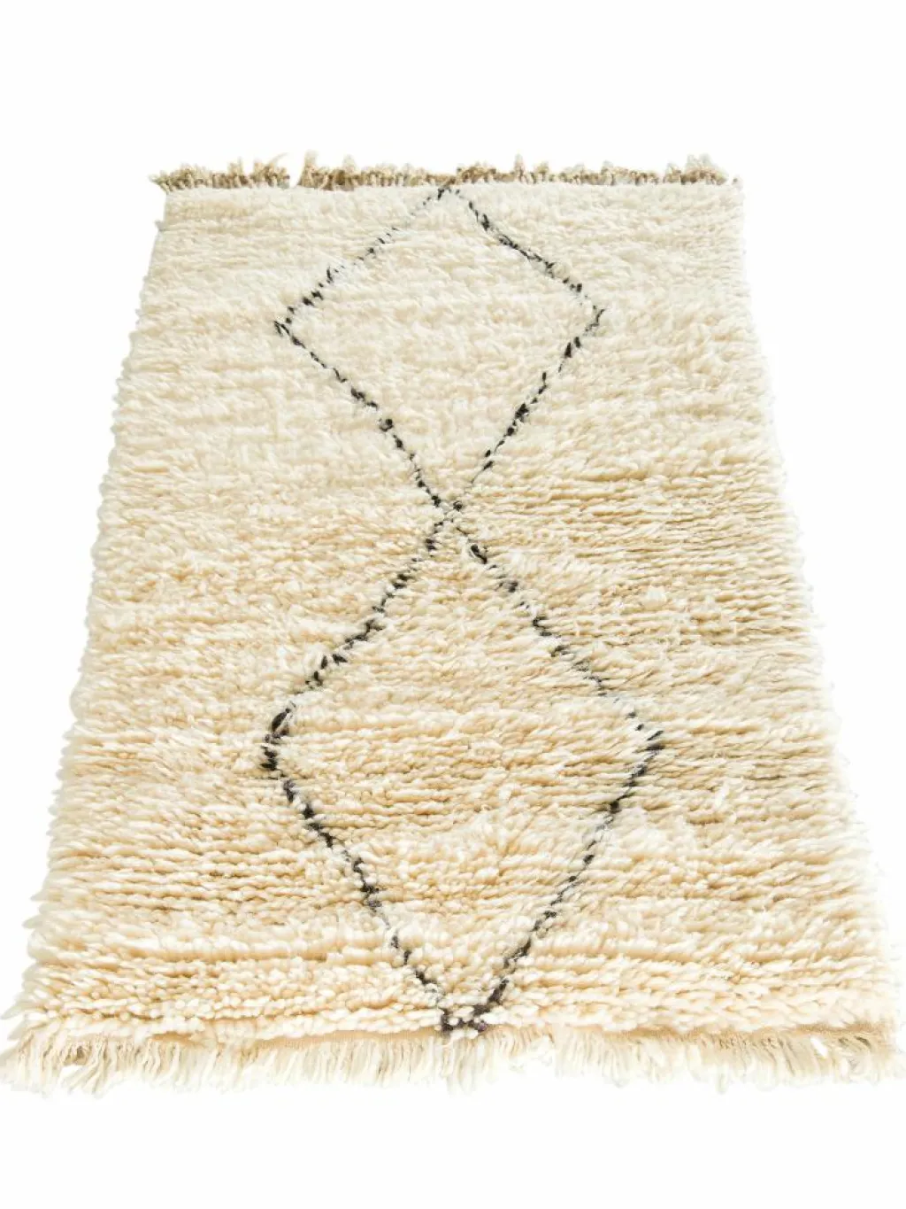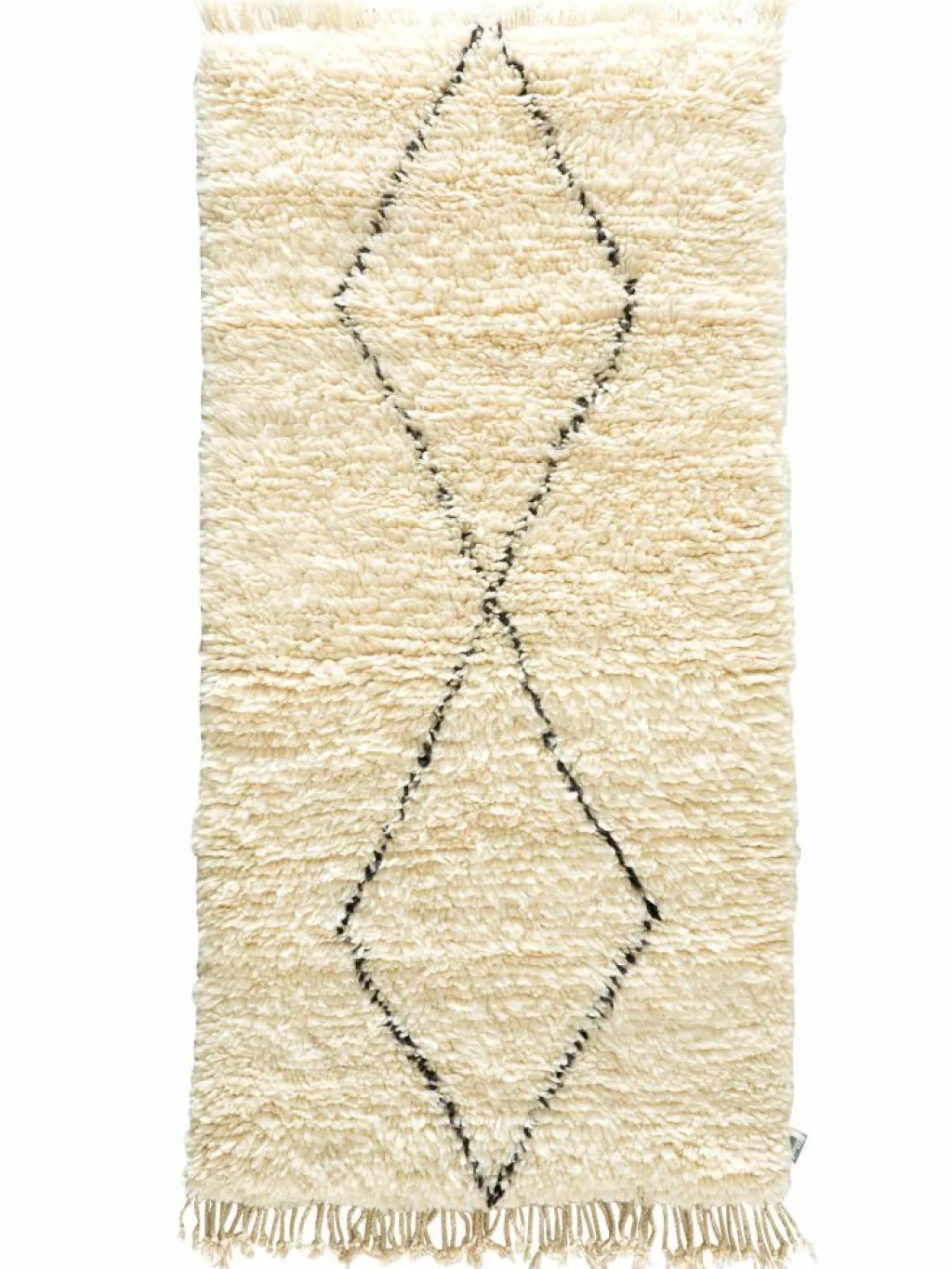 . Die Teppiche sind fast immer weißgrundig und zeichnen sich durch schwarze Zickzack-, Gitter- oder Rauten-Muster sowie einem wohnlich-zotteligen Flor aus. Kaum eine andere Teppichprovenienz passt mit ihren ursprünglichen nomadischen Designs besser in einen minimalistischen Wohnstil. Wie viele andere Nomadenteppiche auch, wurden dieBeni Ourain