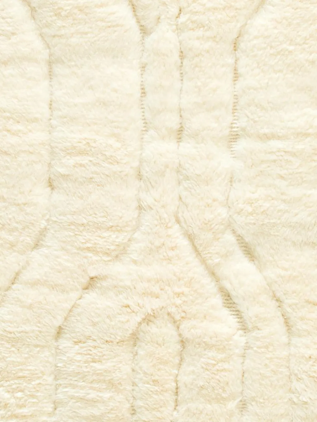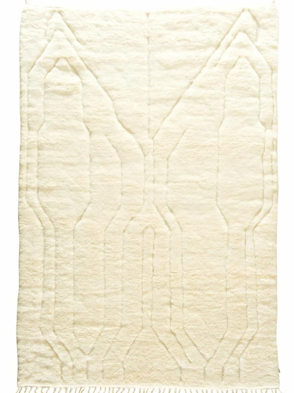 . Die Teppiche sind fast immer weißgrundig und zeichnen sich durch schwarze Zickzack-, Gitter- oder Rauten-Muster sowie einem wohnlich-zotteligen Flor aus. Kaum eine andere Teppichprovenienz passt mit ihren ursprünglichen nomadischen Designs besser in einen minimalistischen Wohnstil. Wie viele andere Nomadenteppiche auch, wurden dieBeni Ourain