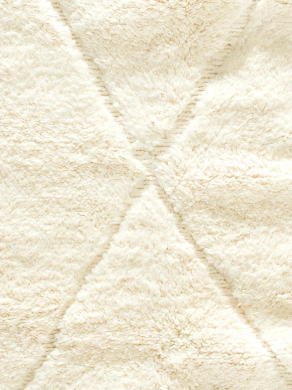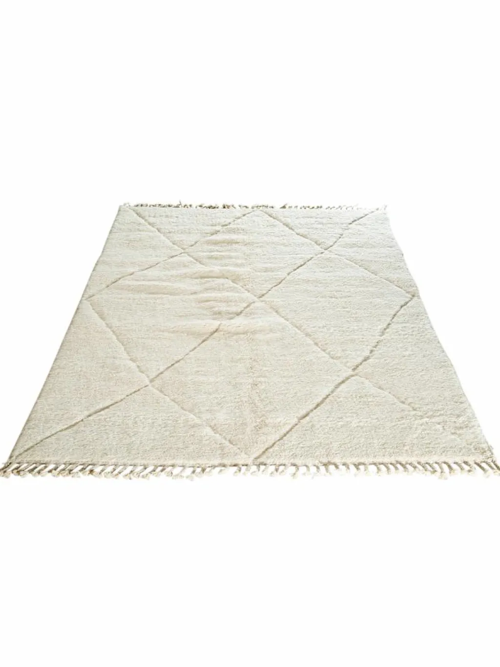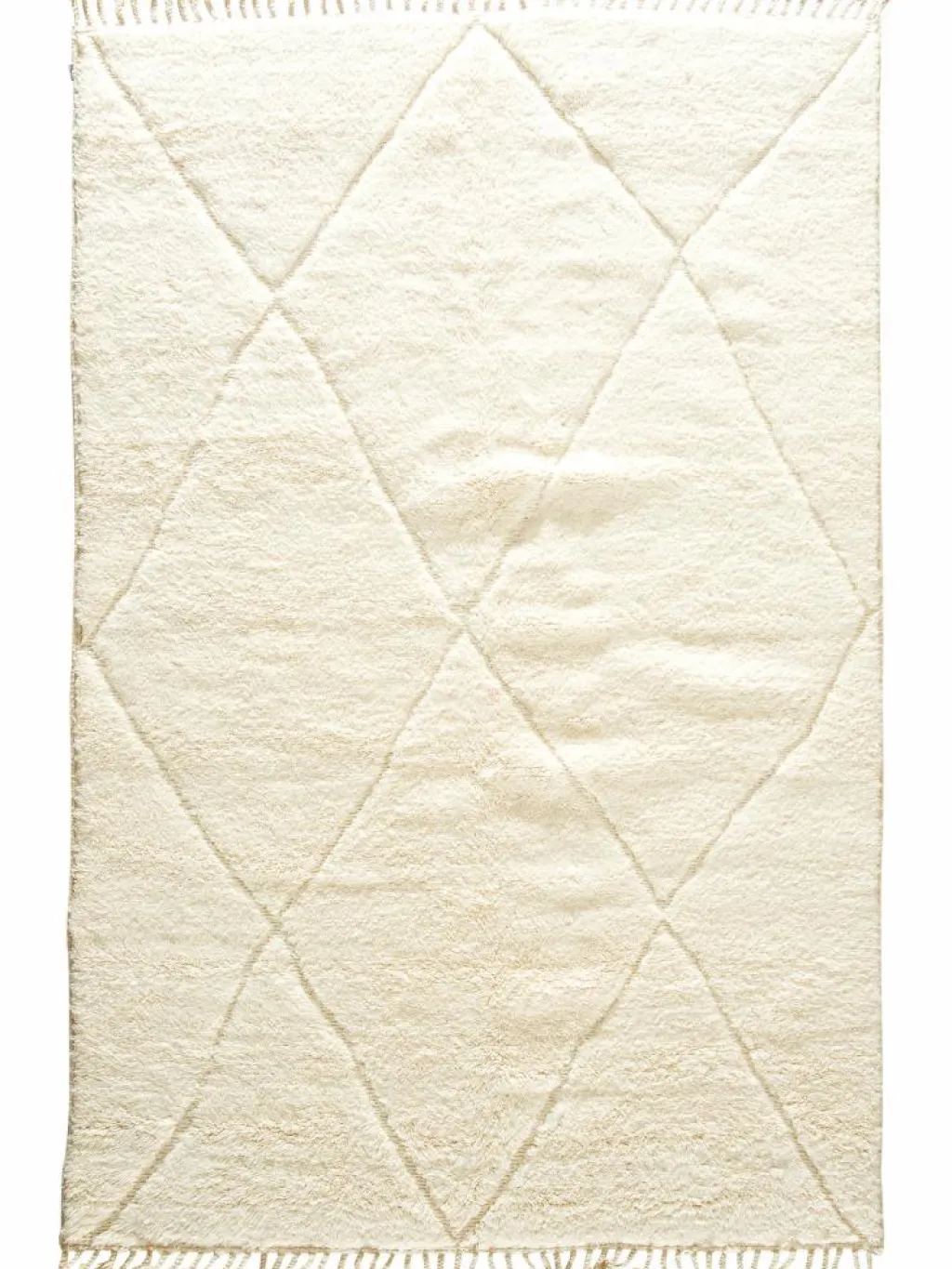 . Die Teppiche sind fast immer weißgrundig und zeichnen sich durch schwarze Zickzack-, Gitter- oder Rauten-Muster sowie einem wohnlich-zotteligen Flor aus. Kaum eine andere Teppichprovenienz passt mit ihren ursprünglichen nomadischen Designs besser in einen minimalistischen Wohnstil. Wie viele andere Nomadenteppiche auch, wurden dieBeni Ourain
