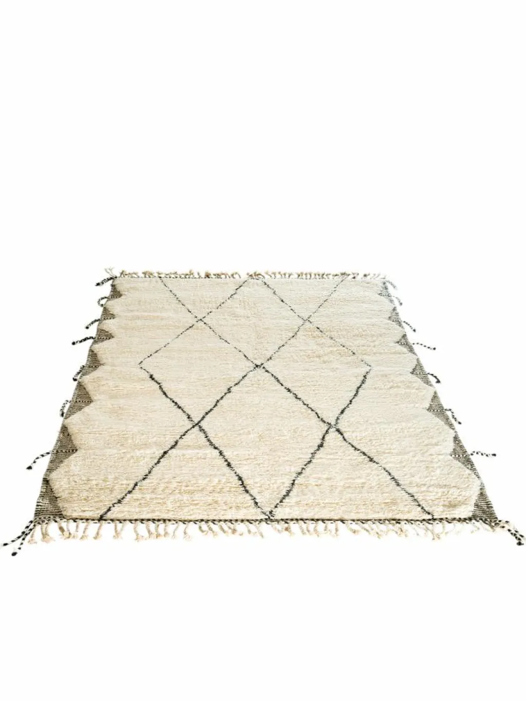 . Die Teppiche sind fast immer weißgrundig und zeichnen sich durch schwarze Zickzack-, Gitter- oder Rauten-Muster sowie einem wohnlich-zotteligen Flor aus. Kaum eine andere Teppichprovenienz passt mit ihren ursprünglichen nomadischen Designs besser in einen minimalistischen Wohnstil. Wie viele andere Nomadenteppiche auch, wurden dieBeni Ourain