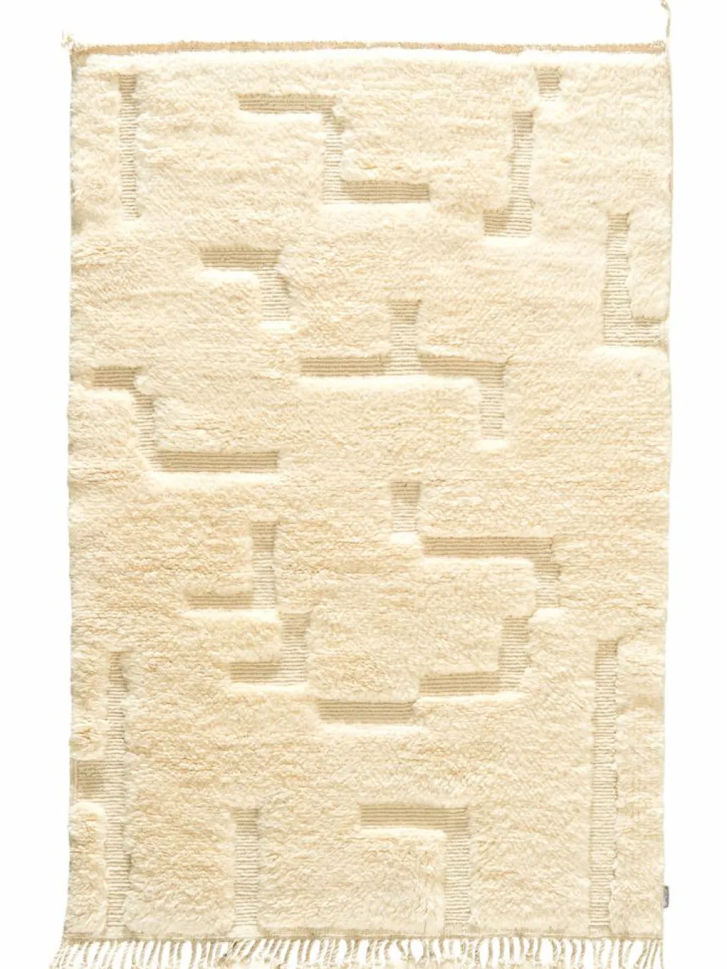 . Die Teppiche sind fast immer weißgrundig und zeichnen sich durch schwarze Zickzack-, Gitter- oder Rauten-Muster sowie einem wohnlich-zotteligen Flor aus. Kaum eine andere Teppichprovenienz passt mit ihren ursprünglichen nomadischen Designs besser in einen minimalistischen Wohnstil. Wie viele andere Nomadenteppiche auch, wurden dieBeni Ourain